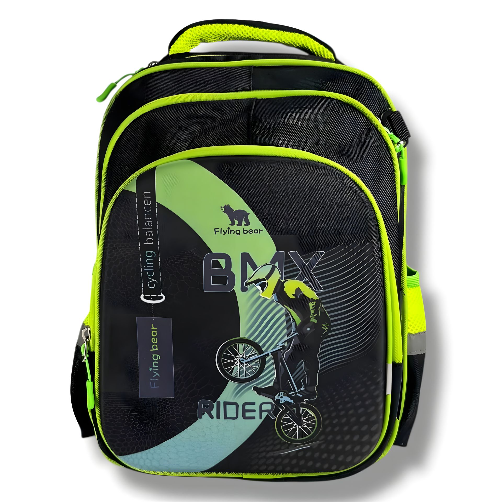 Чорний рюкзак із яскравим принтом велосипедиста — ідеальний аксесуар для енергійного школяра, який обожнює рух і спорт.