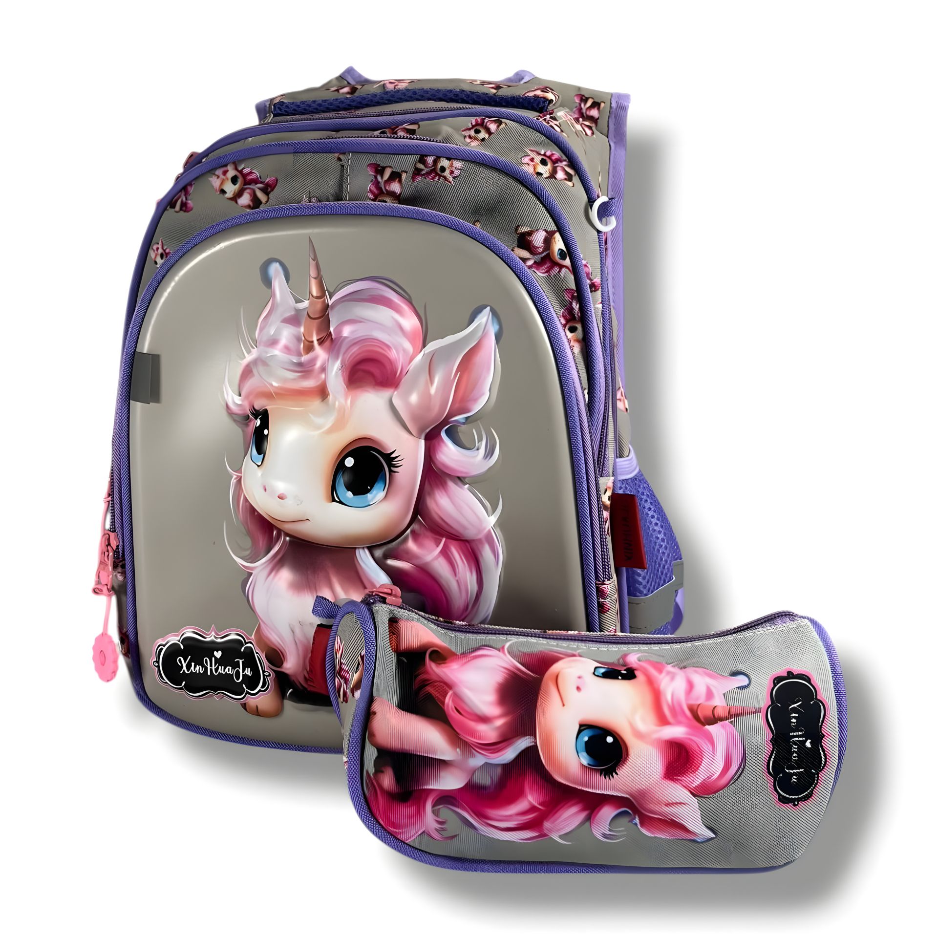 Шкільний рюкзак для дівчаток, з принтом єдинорога, сірий, пенал у комплекті, на 3 відділення