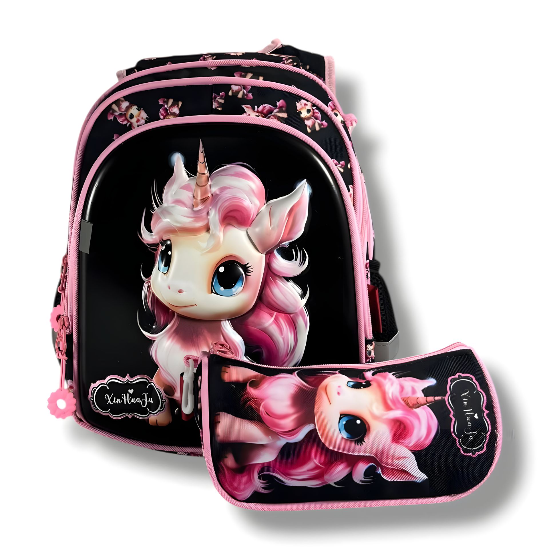 Шкільний рюкзак для дівчаток з принтом єдинорога, пенал у комплекті, чорний, місткий та легкий дизайн