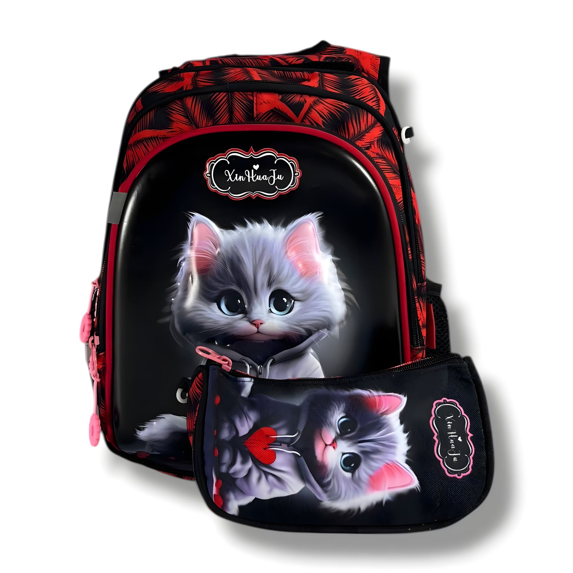 Каркасний рюкзак для дівчаток з принтом котика та пеналомКаркасний рюкзак для дівчаток з принтом котика та пеналом