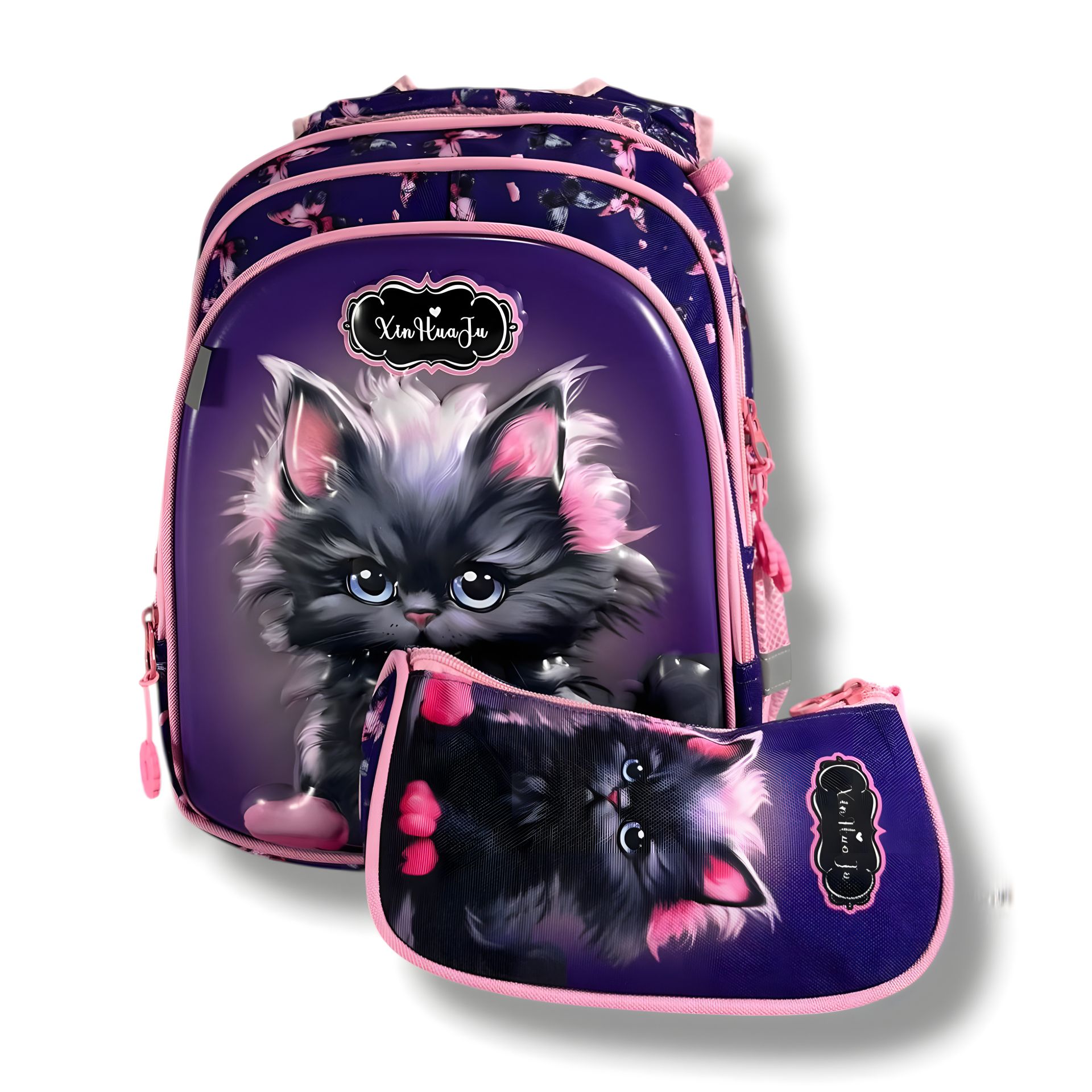 Шкільний рюкзак для дівчаток з принтом котика, каркасний, пенал у комплекті, фіолетовий, 22 л