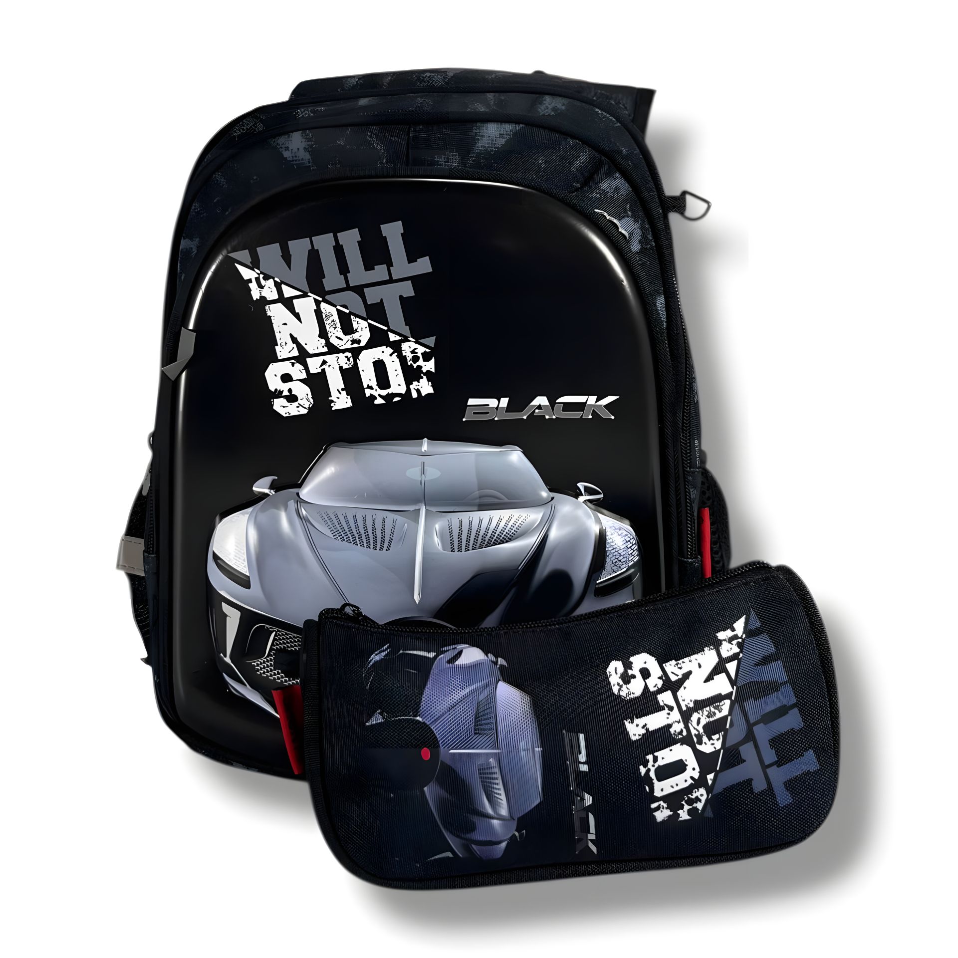 Чорний водонепроникний шкільний рюкзак з принтом "Машинка", 22 л, пенал у комплекті
