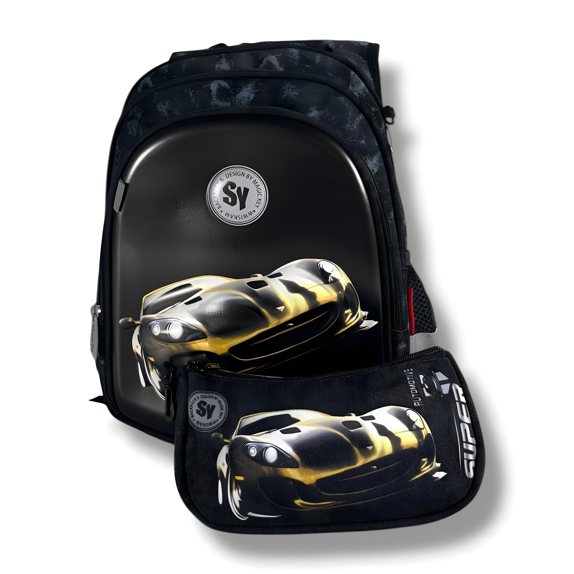Чорний водонепроникний шкільний рюкзак з принтом "Машинка", 22 л, пенал у комплекті