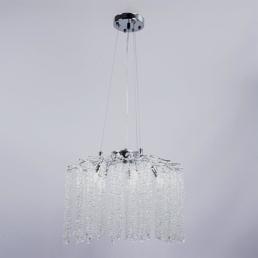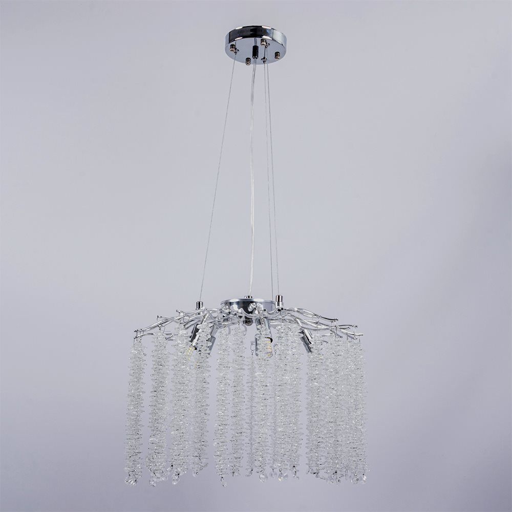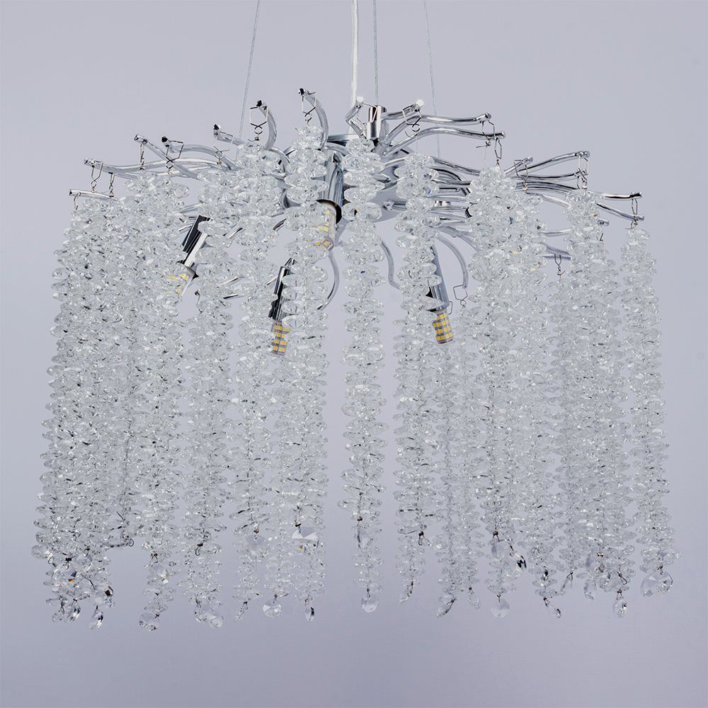 Елегантна підвісна люстра WM-7003 400-G9*5-38 CR стане справжньою прикрасою вашого інтер'єру. Її сучасний дизайн поєднує прозорі кришталеві елементи та сріблястий металевий каркас, що додає вишуканості та розкоші простору.