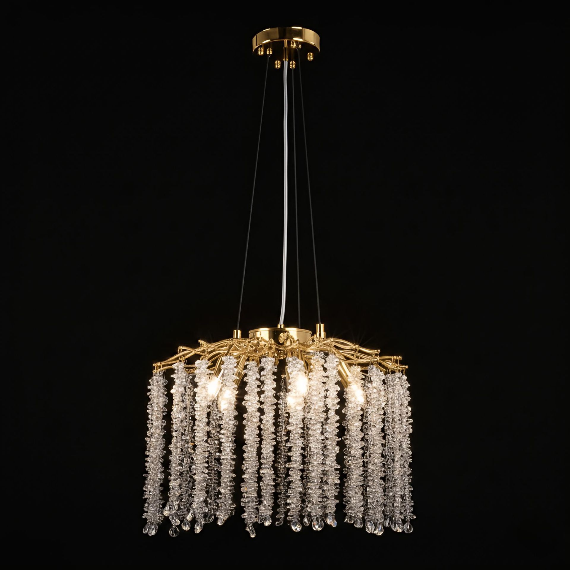 Стильна та вишукана підвісна люстра WM-7003 400-G9*5-38 GD стане яскравим акцентом у будь-якому інтер'єрі. Модель поєднує прозорі кришталеві елементи з золотим металевим каркасом, створюючи ефект розкоші та витонченого стилю.