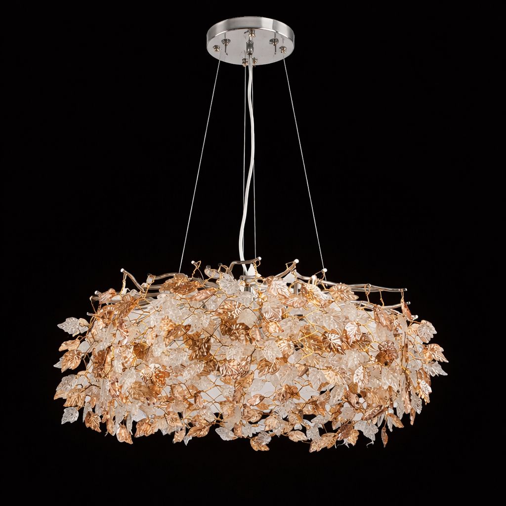 Вишукана підвісна люстра WM-7008 500-G9*6-52 CR — стильне поєднання прозорого кришталю з бурштиновими відтінками. Основа виконана в срібному кольорі, що створює легкий, сучасний акцент у дизайні. Така модель додасть приміщенню розкоші та світла, стане чудовим вибором для просторих віталень, залів, ресторанів або готелів.