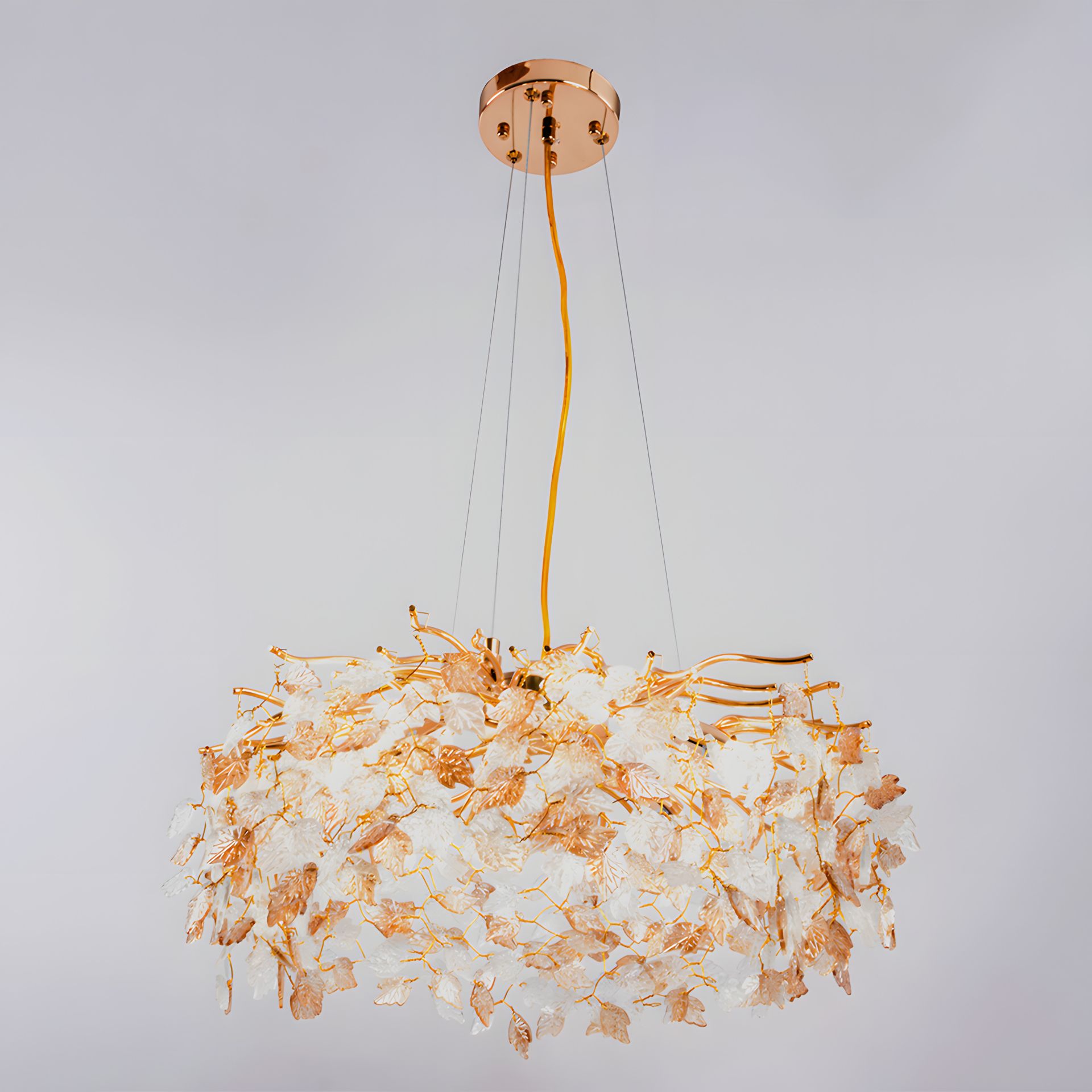 Елегантна підвісна люстра WM-7008 500-G9*6-52 GD — вишукане поєднання прозорого кришталю з бурштиновими відтінками. Основа в кольорі золота додає розкоші та створює атмосферу тепла і затишку у вашому інтер'єрі. Ця модель стане яскравим акцентом у просторих вітальнях, холах, ресторанах чи готелях.