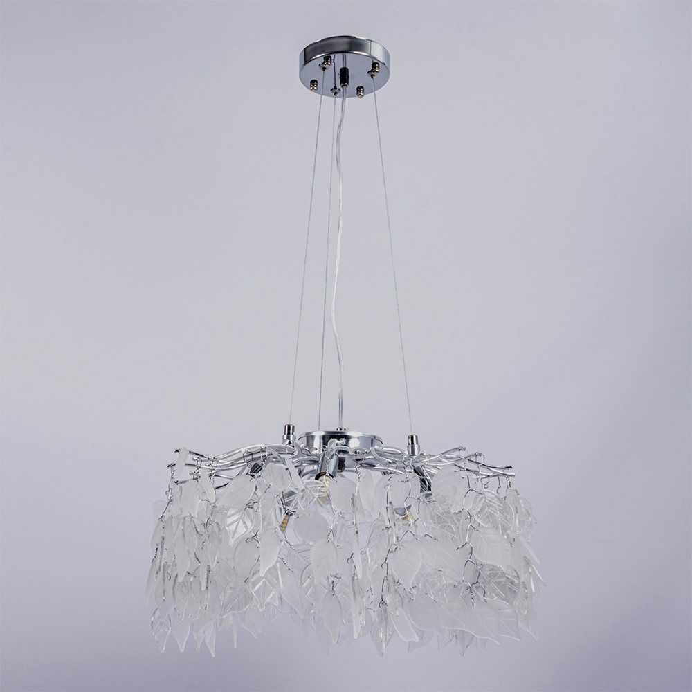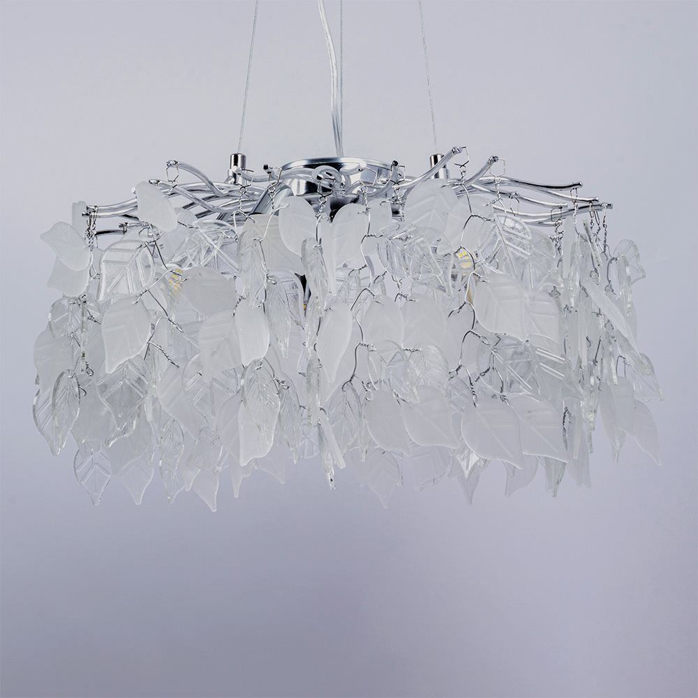 Ця модель із прозорого кришталю та білого матового скла на елегантному срібному каркасі створить неповторну атмосферу у вашому домі або офісі.