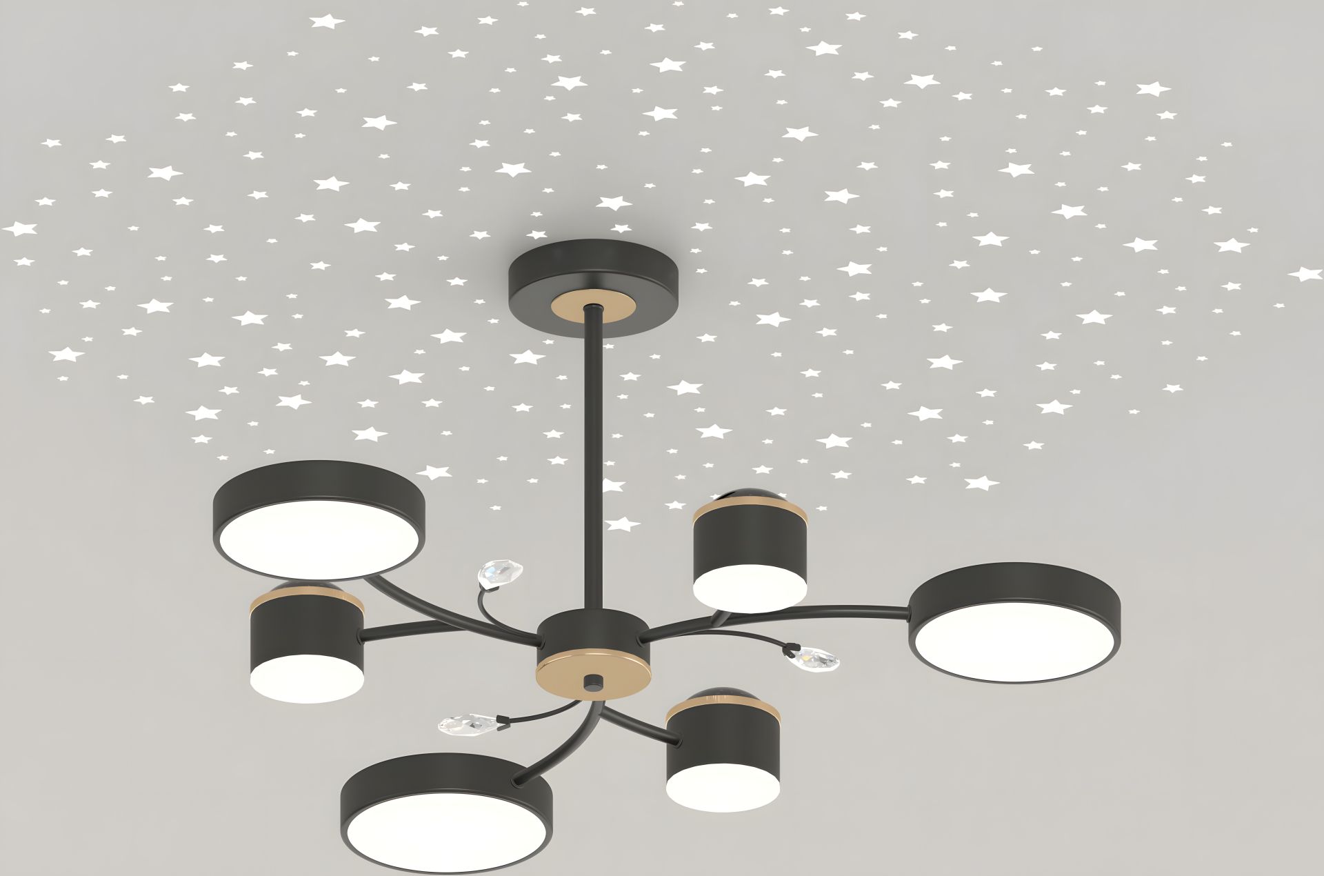 Люстра XI3346-6 — це не просто освітлювальний прилад, а справжнє втілення магії у вашому домі! Поєднання глибокого чорного кольору з вишуканими золотими акцентами створює розкішний вигляд, а її унікальна особливість — проекція зірочок на стелю — перетворить вашу кімнату на казкове нічне небо.