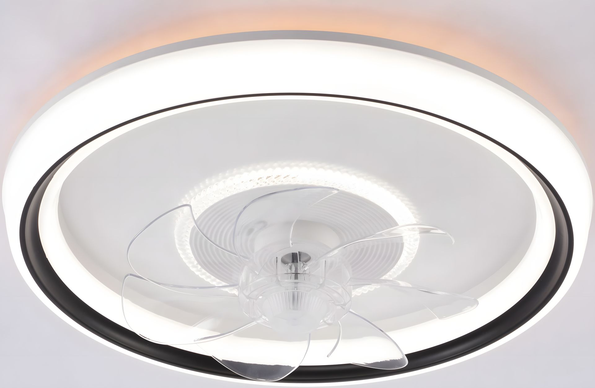 Сучасний стельовий світильник у кольорі білий+чорний, оснащений вбудованим вентилятором для покращеної циркуляції повітря. Джерело світла — LED-плата та LED-лента (180 діодів/м), що забезпечують потужність 101W та світловий потік 7070 Лм. Регульована колірна температура в діапазоні 3000K–6200K дозволяє створити оптимальне освітлення для будь-яких потреб.