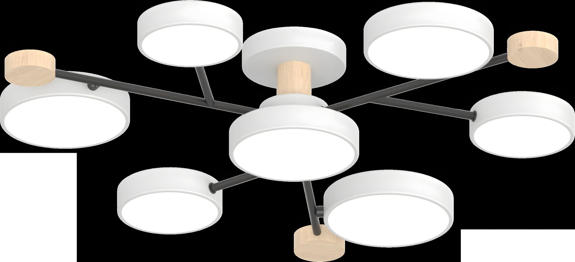 XI3318-7 — сучасний стельовий світильник у кольорі білий+чорний+дерево. Витончений дизайн та поєднання кольорів створюють стильний акцент у будь-якому інтер'єрі. Оснащений потужною LED-платою, що забезпечує яскраве освітлення для великих просторів: віталень, кухонь, офісів. Можливий вибір колірної температури освітлення: теплий, нейтральний або холодний білий.