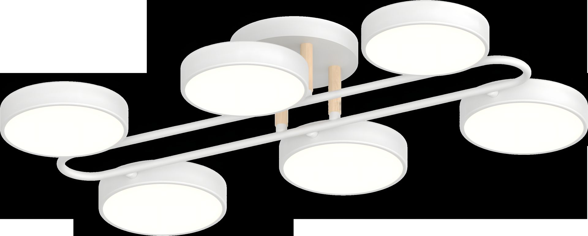 Сучасна стельова люстра XI3322-6 поєднує білий метал і елементи з дерева, створюючи теплий та стильний вигляд. Завдяки своїй формі та потужній LED-платі, вона рівномірно освітлює приміщення, підходить для вітальні, спальні або офісу.