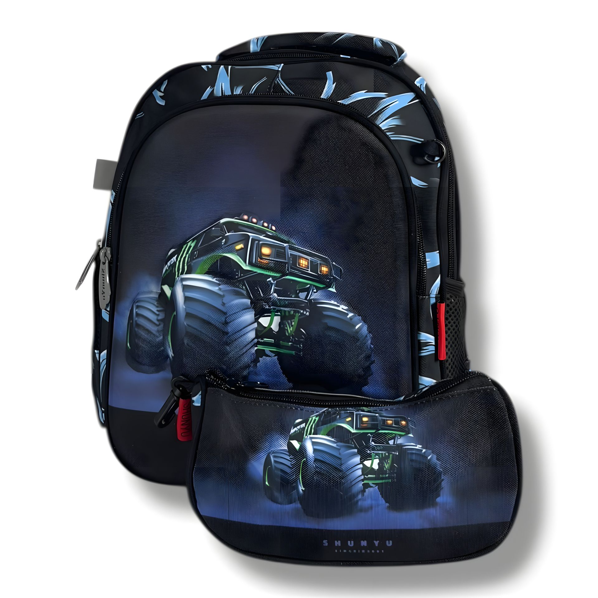 Шкільний рюкзак для хлопчиків, водонепроникний, з принтом Монстр-трак, чорний, пенал у комплекті