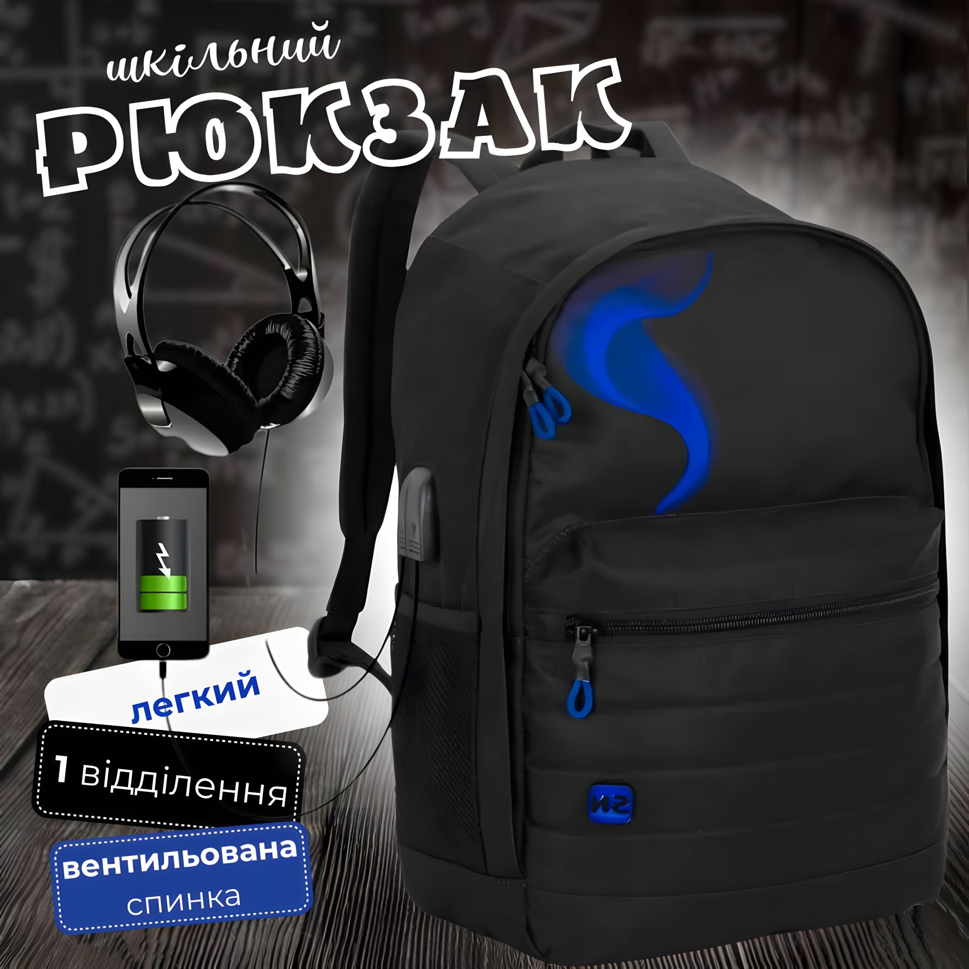Рюкзак шкільний для підлітків з USB-слотом, чорний з синім, зручний та місткий
