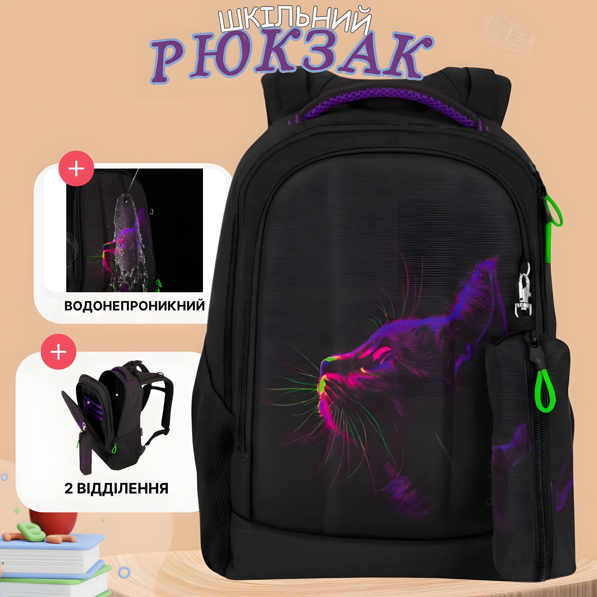 Шкільний рюкзак для підлітків, на 2 відділення, з пеналом у комплекті, принт Котик