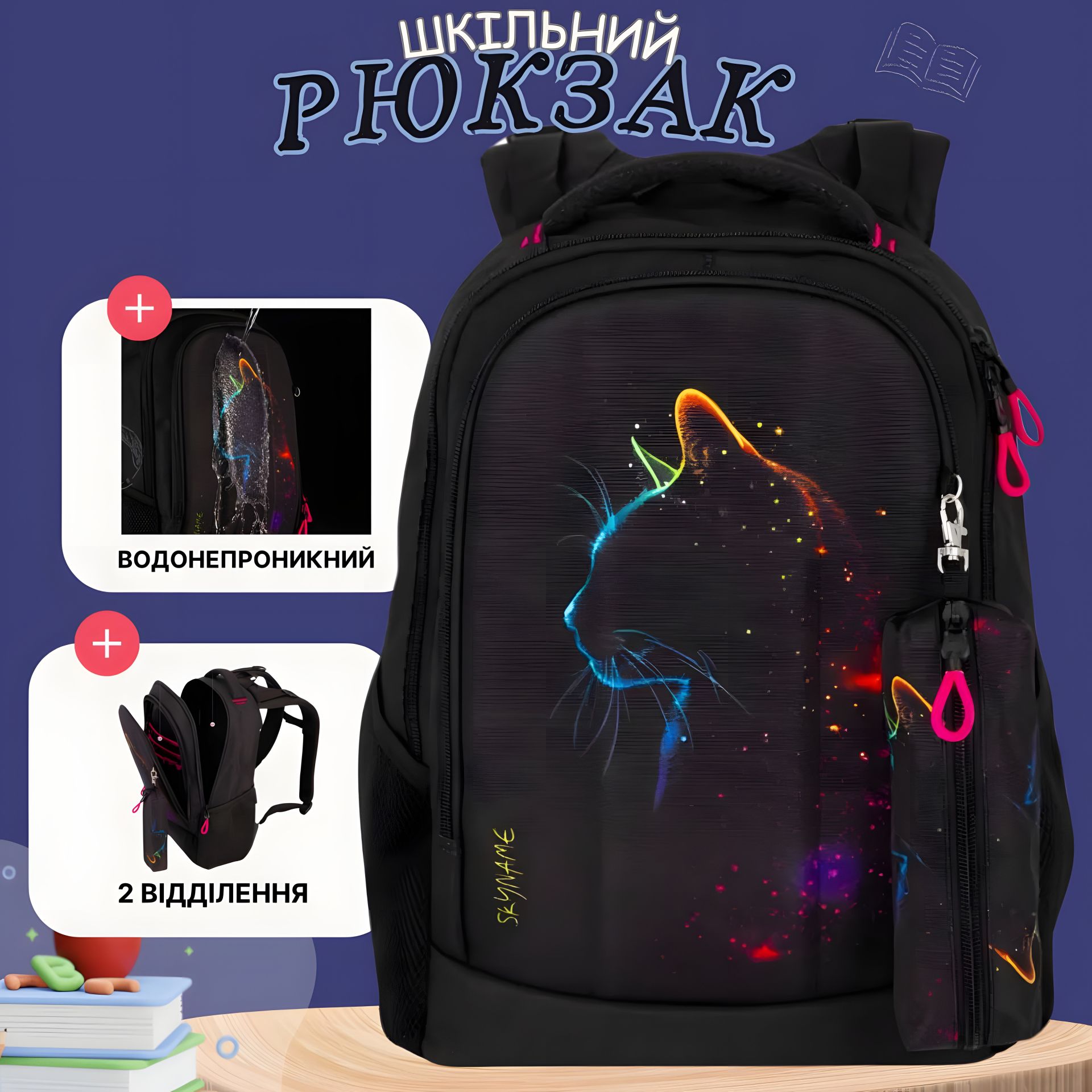 Шкільний рюкзак для підлітків, на 2 відділення, з пеналом у комплекті, принт Котик