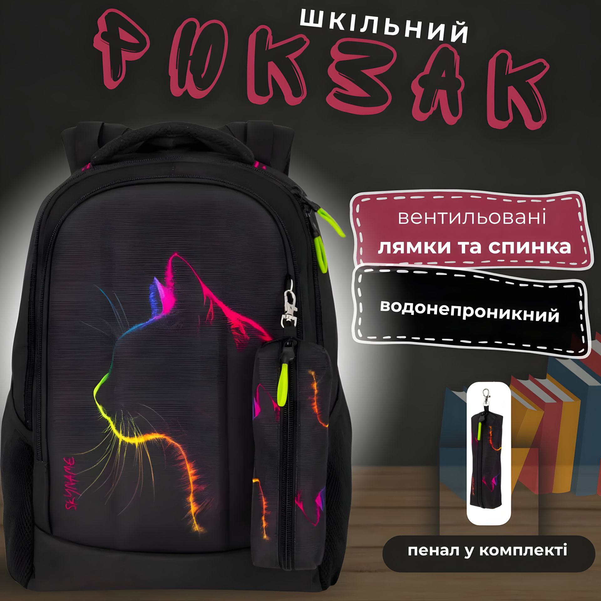 Шкільний рюкзак для підлітків, на 2 відділення, пенал у комплекті, принт Котик, чорний