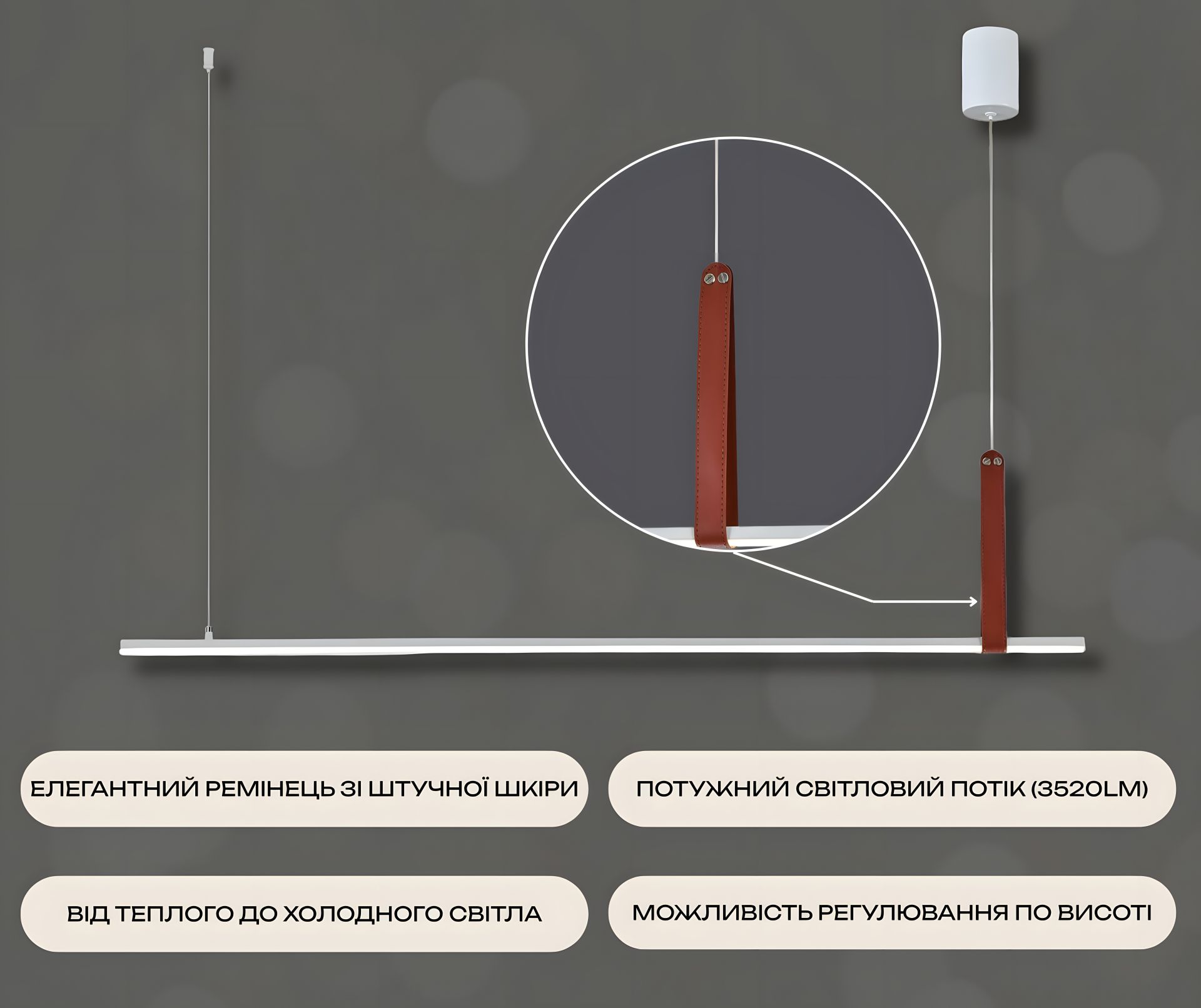Підвісний світлодіодний світильник G 2810/1100 — це сучасне рішення, що вражає своїм мінімалістичним дизайном та елегантним поєднанням матеріалів. Тонка лінійна форма в білому кольорі доповнена оригінальним декоративним елементом зі штучної шкіри, що надає світильнику унікального вигляду.