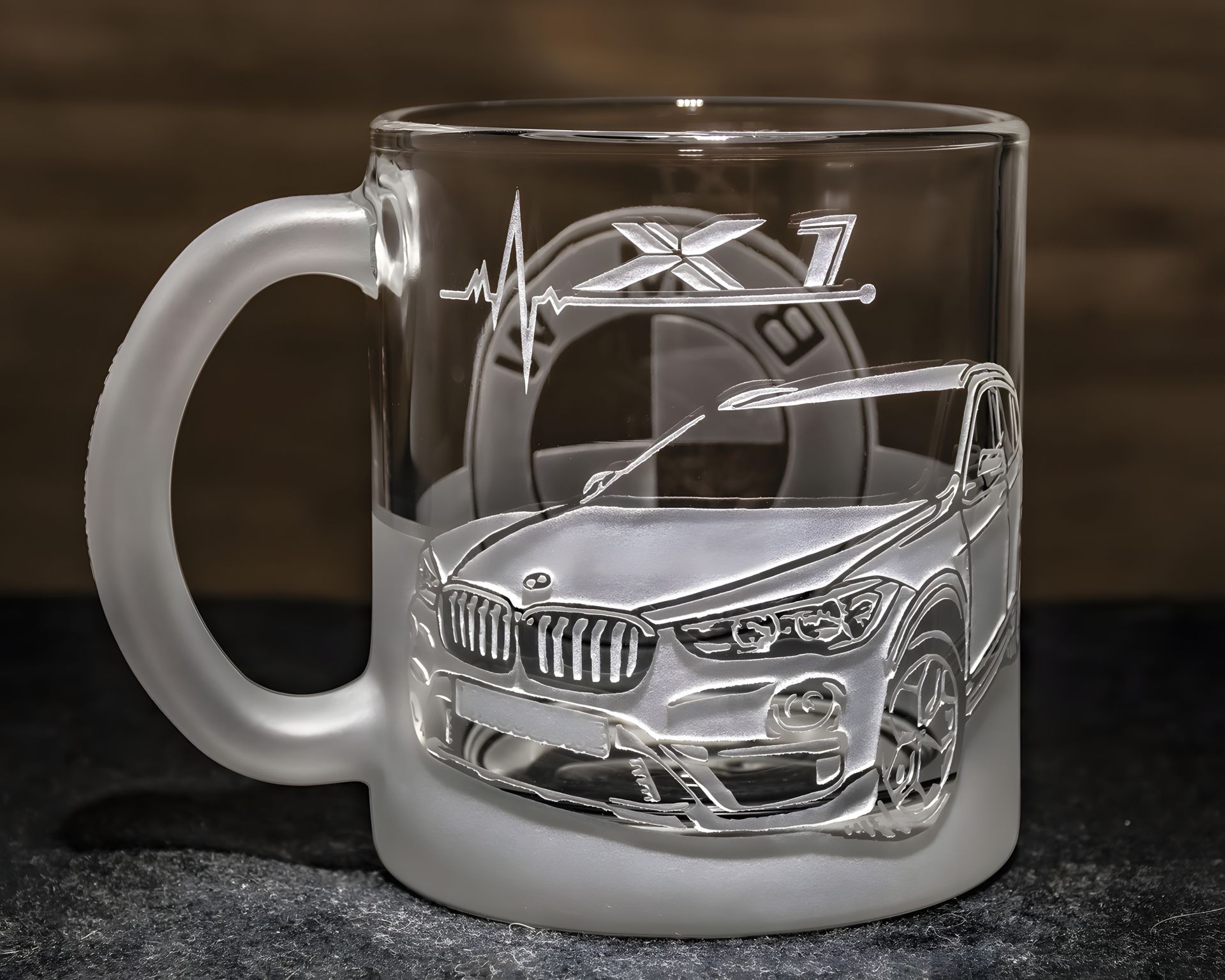 Чашка з гравіюванням автомобіля BMW X1 і логотипу з матовою ручкою в подарунковій коробці