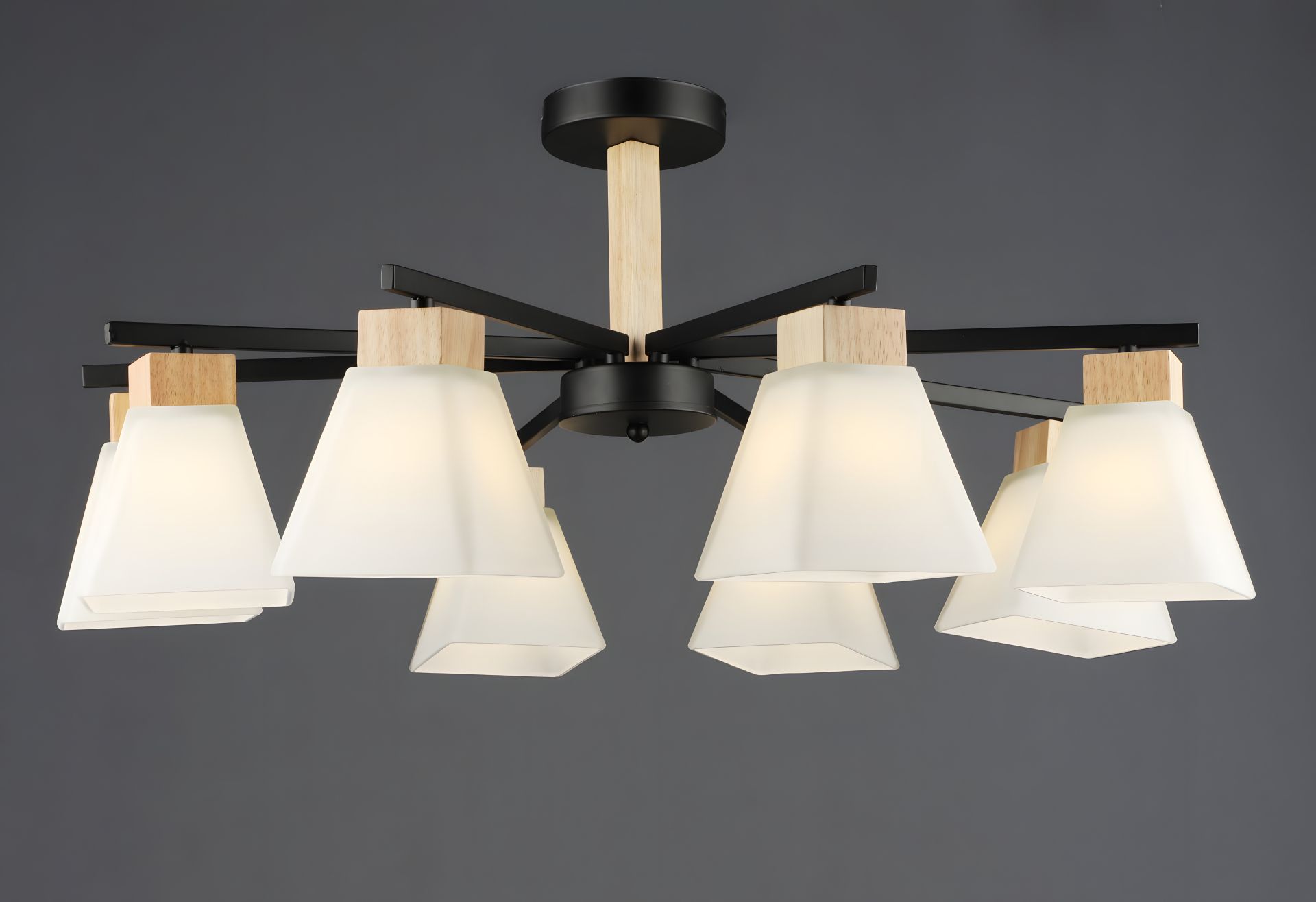 Вишуканий дизайн та преміальні матеріали: Люстра N6608/8 вражає своїм гармонійним поєднанням трендового чорного кольору та натуральних, теплих дерев'яних елементів. Цей контраст додає глибини та універсальності, дозволяючи люстрі ідеально вписатися у стилі лофт, модерн, скандинавський або мінімалістичний інтер'єр. Виготовлена з високоякісної сталі та міцного скла, вона гарантує виняткову довговічність та надійність.