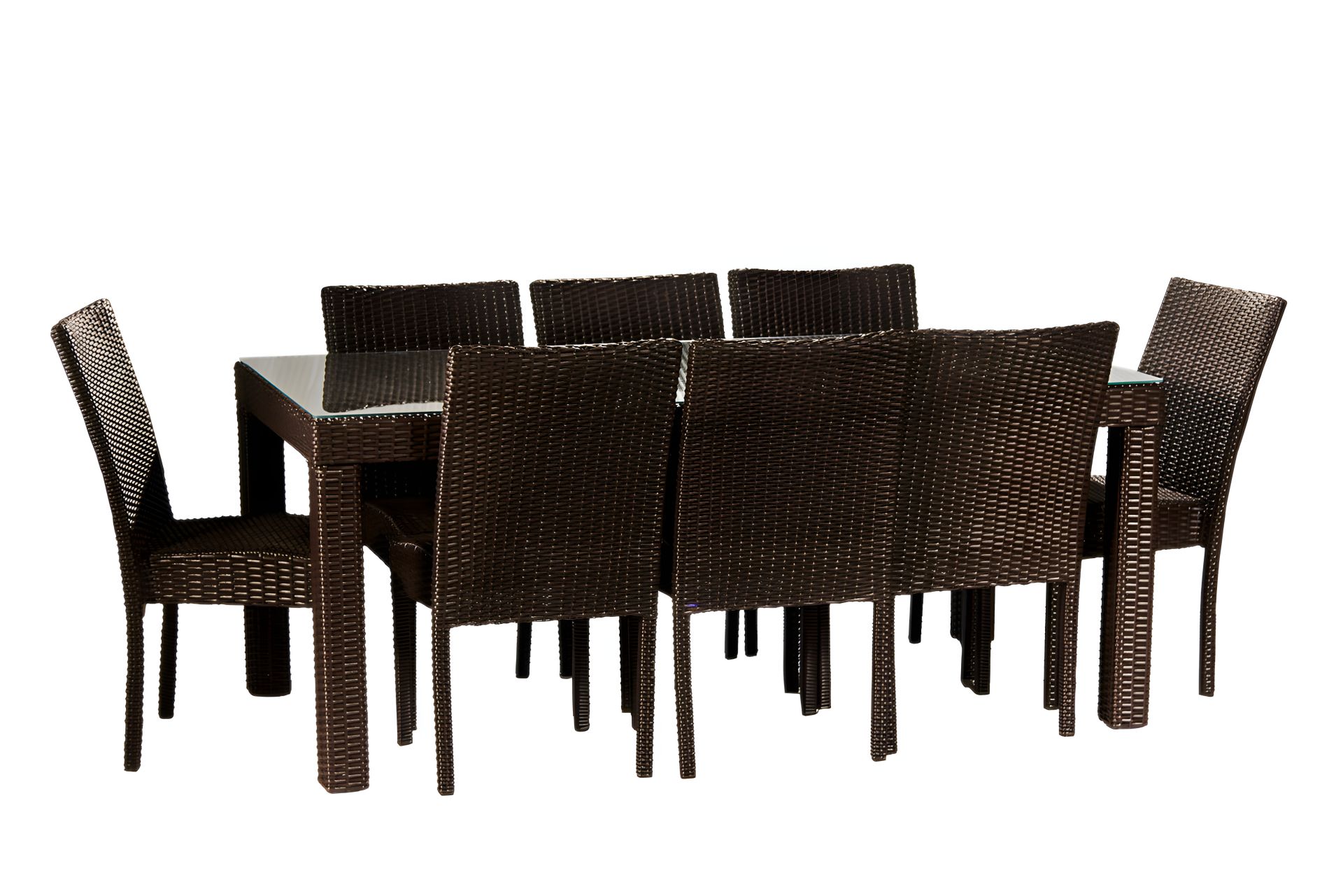 СОЛІН МАКСІ – комплект садових меблів з ротанга для компанії друзів і великої родини. У наборі великий прямокутний стіл, покритий прозорим склом і 8 крісел без підлокітників. Комплект виготовлений з штучного ротанга, стійкого до УФ випромінювання, різких перепадів температури і вологості, не деформується при експлуатації, легко обслуговується.