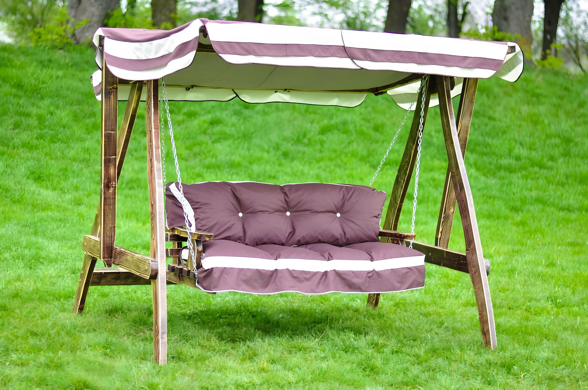 Елегантна, садова дерев’яна гойдалка БЛЮЗ виготовлена з дерева хвойних порід. Штучно зістарене дерево надає їй вишуканості та неповторності. Дерево покрите олією на основі натурального воску. Ви відчуєте справжні хвилини ніжності та насолоди з комфортними подушками на балдахіном.