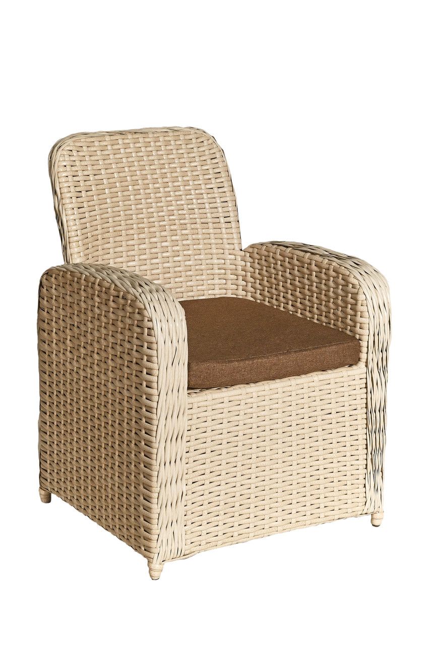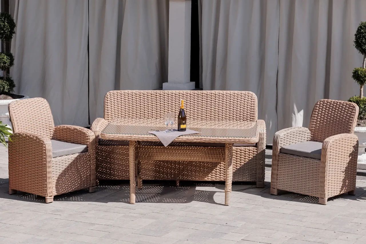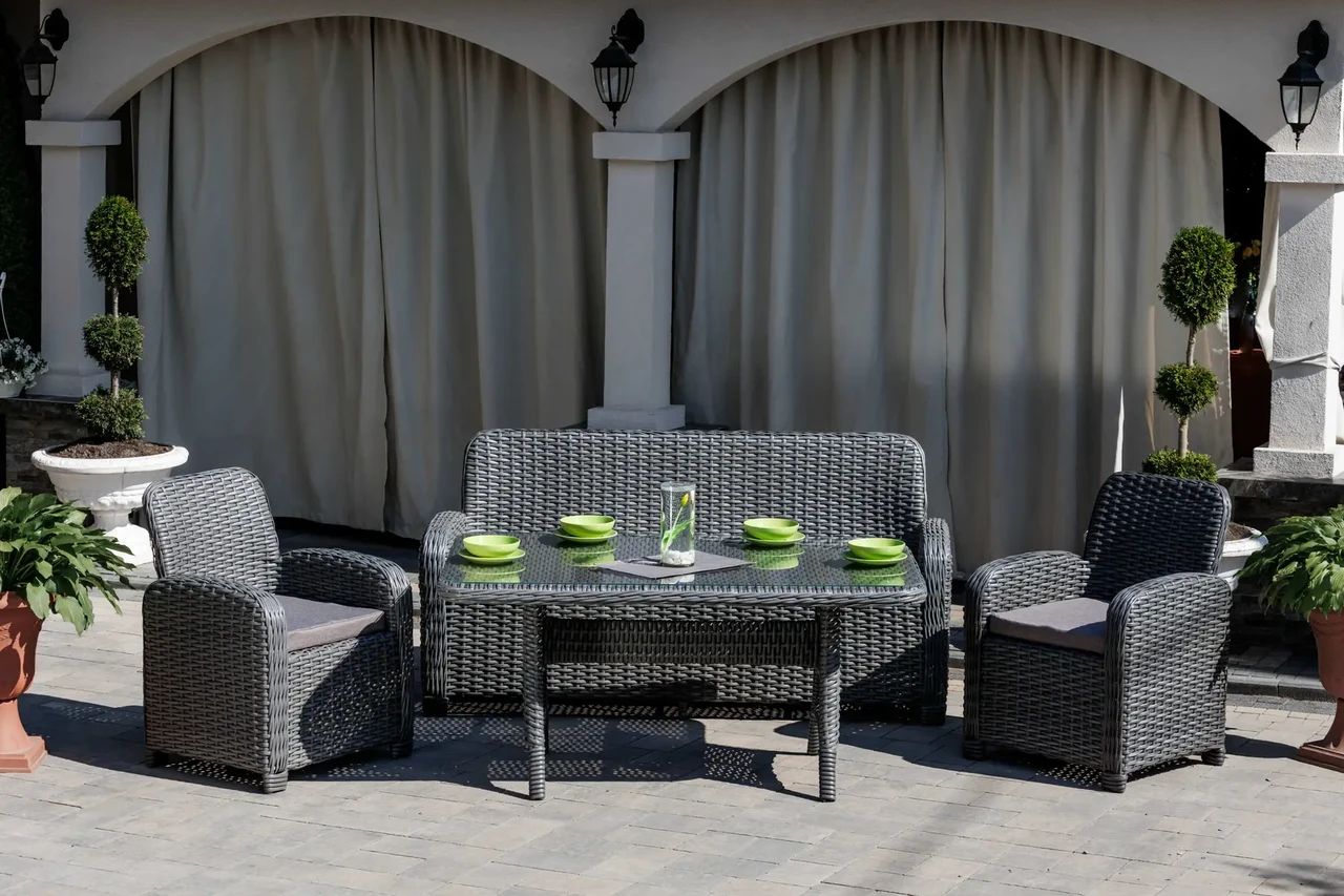 Стильний комплект садових меблів з ротангу АМЕЛІЯ складається із дивану, 2 крісел та столику. Диван та крісла мають зручні пологі підлокітники, що добре підтримують руку. Стіл покритий прозорим склом на фіксаторах. Набір подушок, що входить до комплекту гарантовано забезпечить максимум релаксу і дозволить відпочити по-справжньому Вам і Вашим гостям. Комплект виготовлено із штучного ротангу, який стійкий до УФ променів, різких перепадів температур та зміни вологості, не деформується при використанні, легкий у догляді. Основа меблів – металевий каркас.