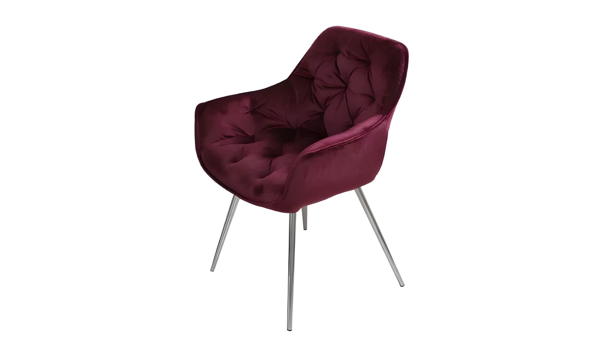 Стілець виконаний в ергономічному дизайні і характеризується злегка закругленими краями. Зручна фігурна спинка в поєднанні з оксамитовою бордовою оббивкою надають виробу особливого шику. Матеріал дуже приємний на дотик. Металевий каркас відповідає за стійкість стільця і може витримувати великі навантаження. Зручні підлокітники створюють додатковий комфорт під час занурення на стілець.