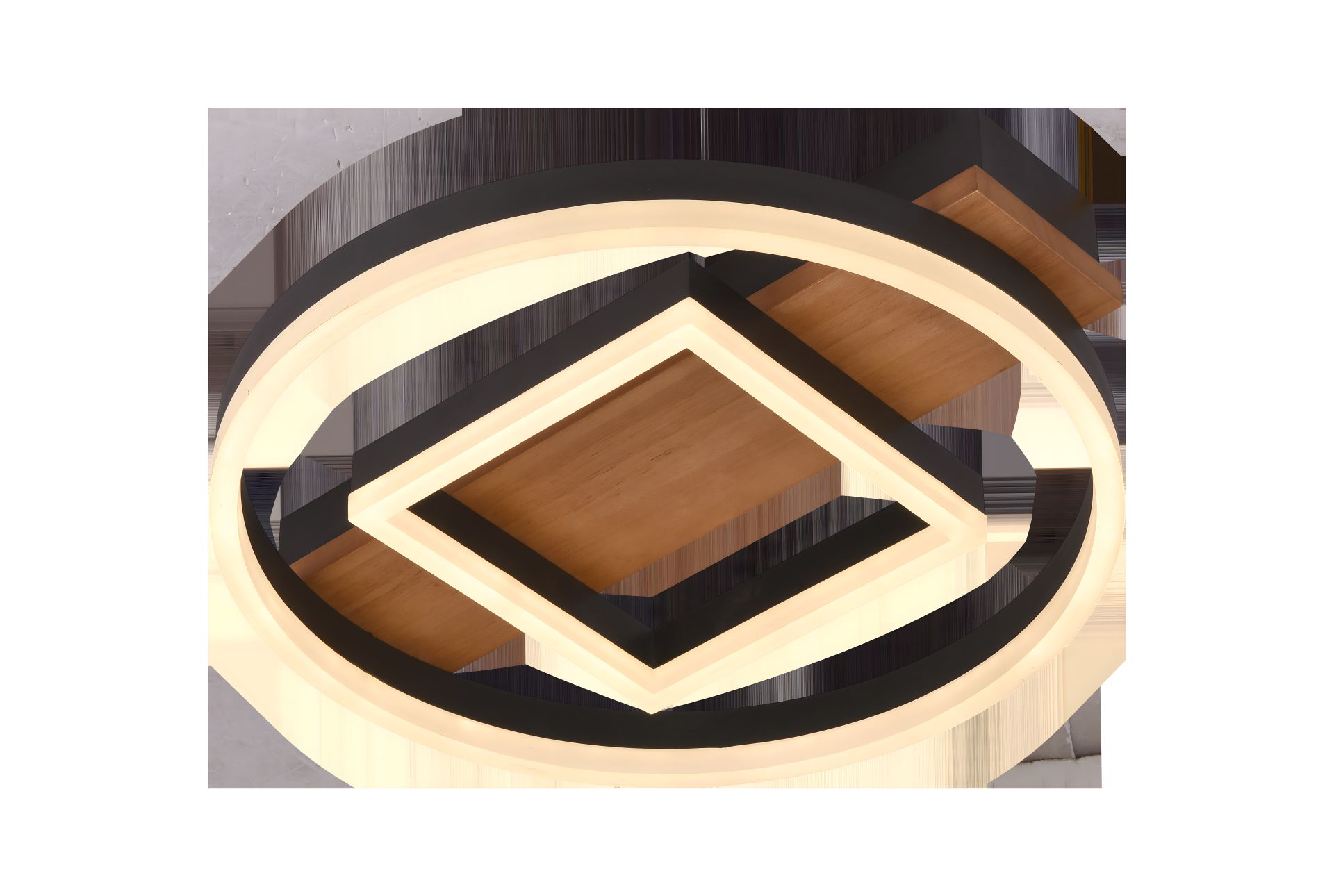 Люстра має оригінальний геометричний дизайн, що складається з великого чорного металевого кільця, всередині якого розташований ромбоподібний елемент з підсвічуванням. Центральну частину люстри доповнюють натуральні дерев'яні декоративні елементи, що проходять по діагоналі. Вона гармонійно поєднує в собі міцну сталь, дерево та легкий акрил, що забезпечує довговічність та естетичний вигляд. Вбудовані світлодіодні модулі забезпечують високу ефективність та рівномірне освітлення. Люстра кріпиться впритул до стелі, створюючи акуратний та сучасний вигляд.