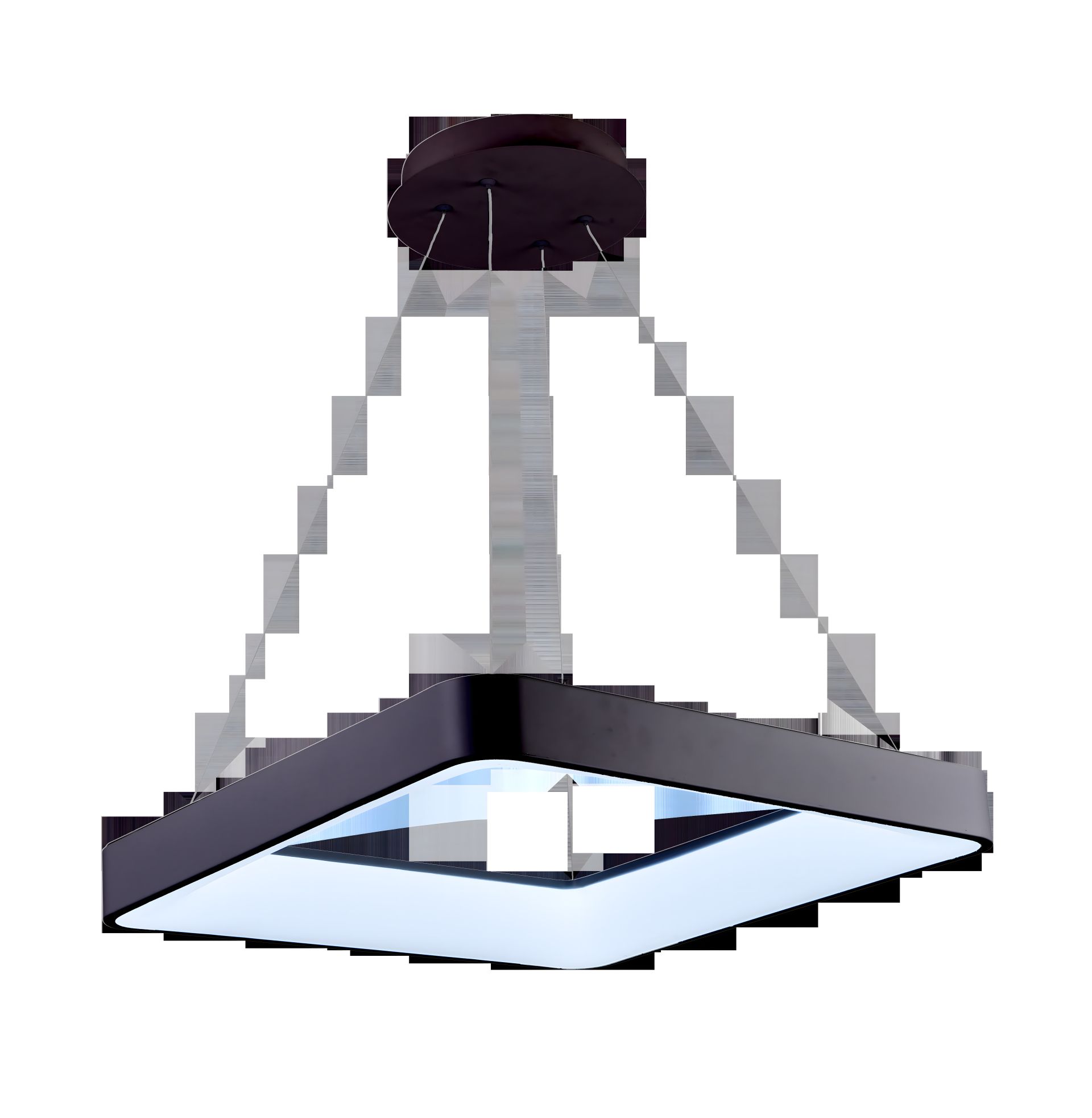 Люстра має лаконічний квадратний дизайн із заокругленими кутами, як видно на наданому зображенні. Вона виконана з комбінації міцної сталі та легкого акрилу, що забезпечує довговічність та естетичний вигляд. Чорний колір робить її універсальною, легко вписуючися в будь-який сучасний інтер'єр, від мінімалізму до хай-теку. Вбудований світлодіодний модуль забезпечує високу ефективність та рівномірне освітлення. Люстра підвішується на тросах, що підкреслює її сучасний вигляд.