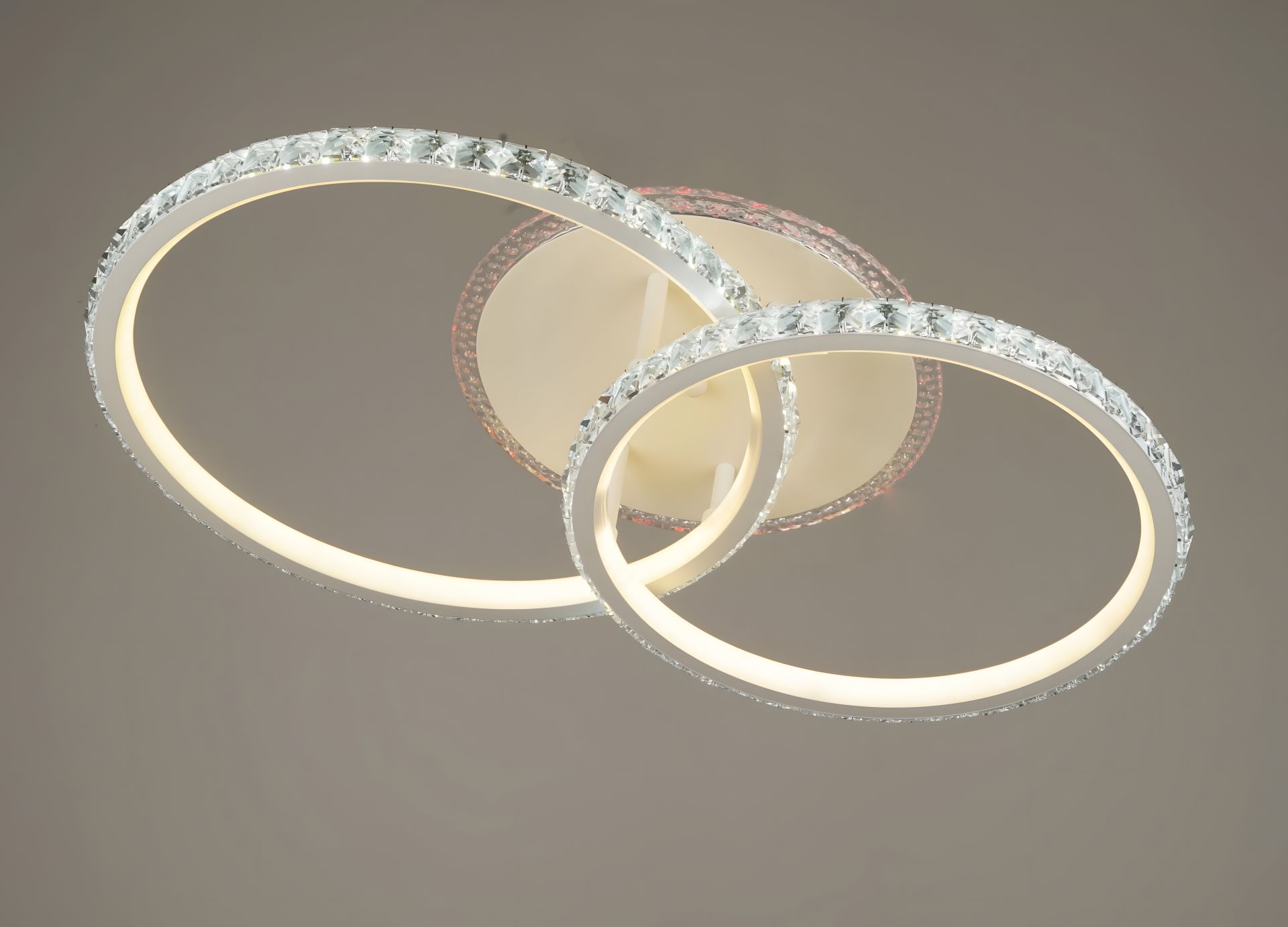 Стельова світлодіодна люстра VALESO YT393/2 — це інноваційне рішення для тих, хто цінує не лише яскраве освітлення, але й можливість створювати унікальну атмосферу. Ця модель поєднує основне яскраве світло та декоративну RGB-підсвітку, що дозволяє кімнаті сяяти різними кольорами. Люстра виконана у чистому білому кольорі з використанням якісної сталі та елементів зі скла.