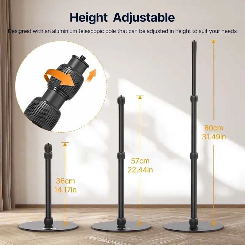 Ulanzi Vijim LS09 — це універсальна та стійка стійка, призначена для смартфонів, екшн-камер, легких DSLR-камер, проекторів, кільцевого світла та іншого обладнання. Завдяки міцній круглій металевій базі та компактній конструкції штатив ідеально підходить як для домашнього, так і для виїзного використання. Він легко встановлюється як на стіл, так і на підлогу, забезпечуючи стабільність та гнучкість у будь-яких умовах зйомки.