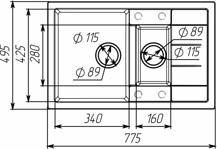 Розміри мийки – 775х495х190 мм, вага – 14,2 кг, сифон – євросифон з широкою горловиною, 110 мм.