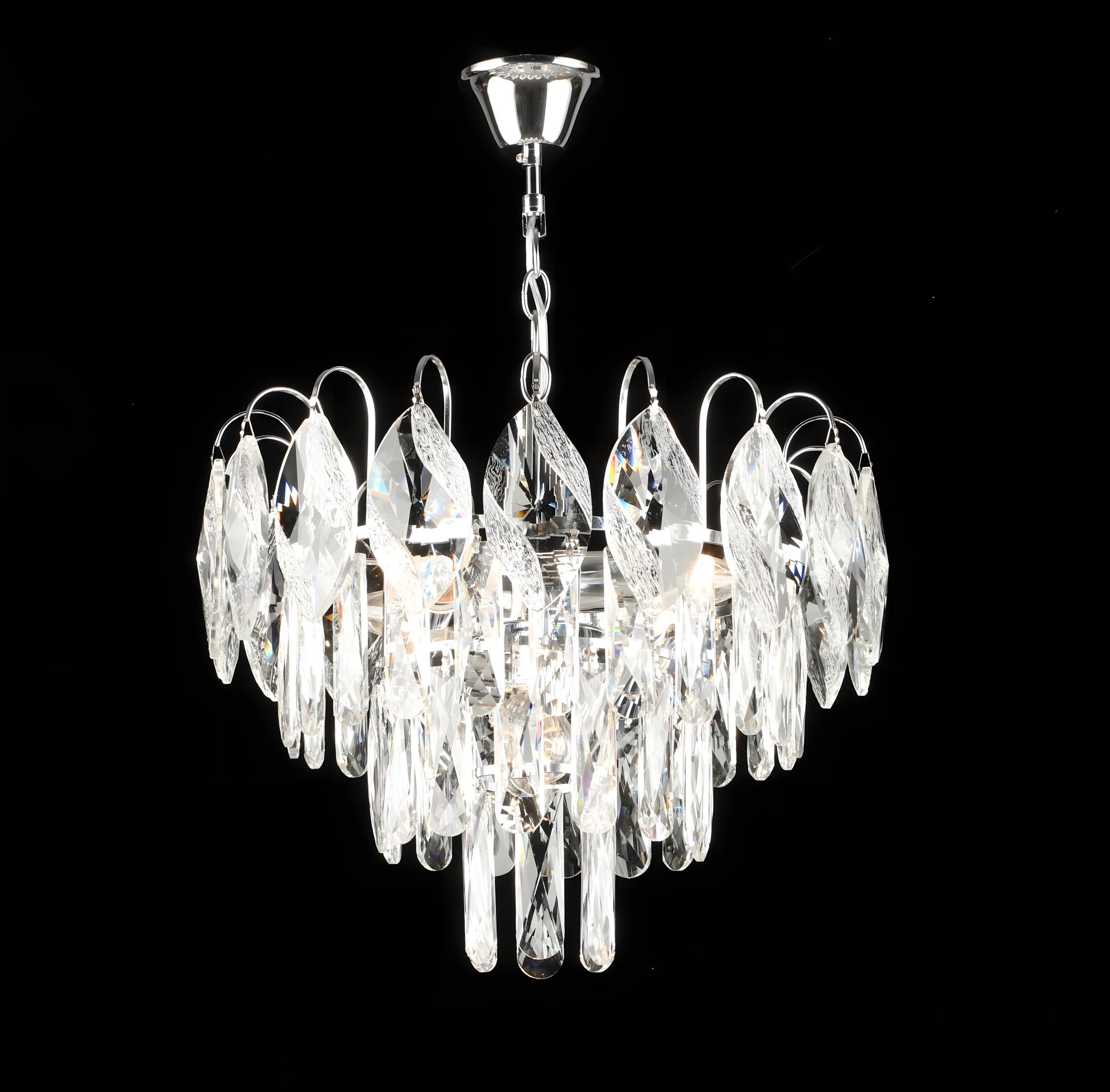 Виготовлена з високоякісної сталі та витонченого скла, що імітує кришталеві елементи, люстра E2716/5 вирізняється довговічністю та класичним дизайном з сучасними нотками. Її оптимальні розміри (Ø400 × H330 мм) дозволяють гармонійно вписатися в більшість інтер'єрів, а хромоване покриття додає відчуття розкоші та сучасності.
