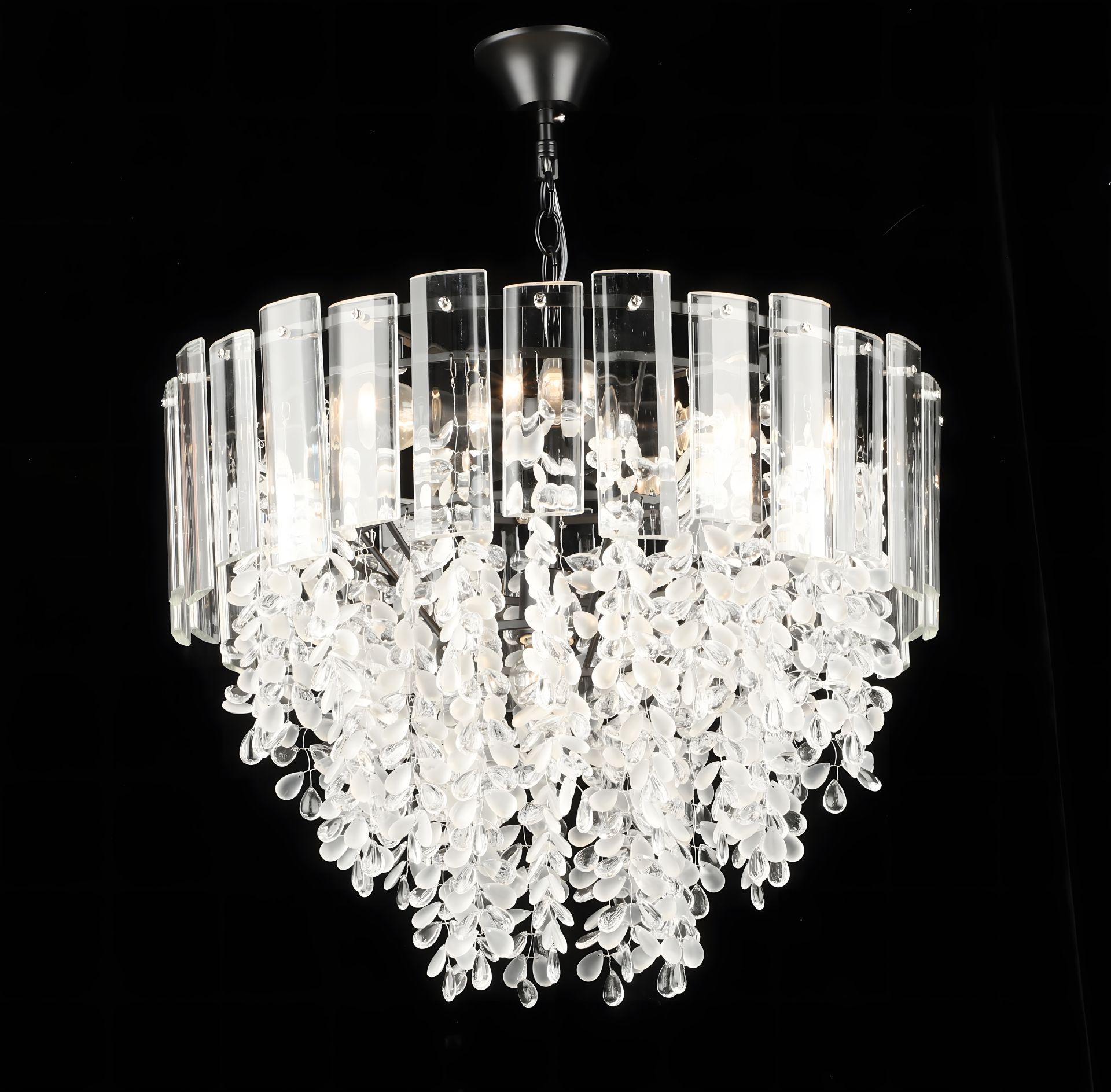 Виготовлена з високоякісної сталі та витонченого скла, що імітує кришталеві елементи, люстра S2475/6 вирізняється довговічністю та сміливим дизайном з сучасними нотками. Її оптимальні розміри (Ø500 × H380 мм) дозволяють гармонійно вписатися в більшість інтер'єрів, а глибокий чорний колір створює ефектний контраст, підкреслюючи блиск кришталевих елементів.