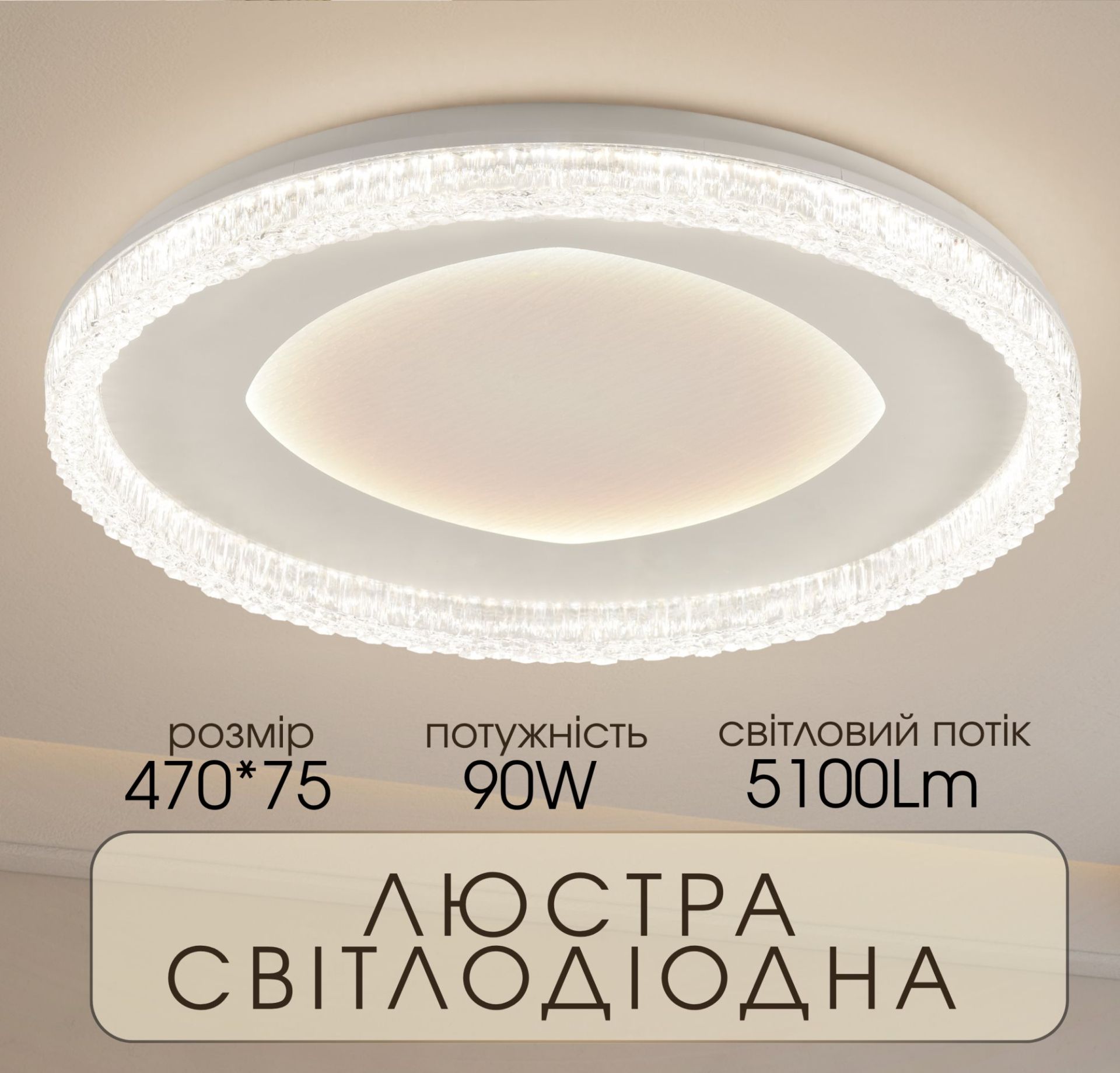 Модель оснащена вбудованими світлодіодами та має вражаючу загальну потужність 60W+30W, що дає потужний світловий потік у 5100 Lm. Ця особливість дозволяє ефективно освітлювати значну площу. Керування здійснюється традиційним способом, оскільки пульт дистанційного керування не передбачено, що робить використання люстри простим та зручним.