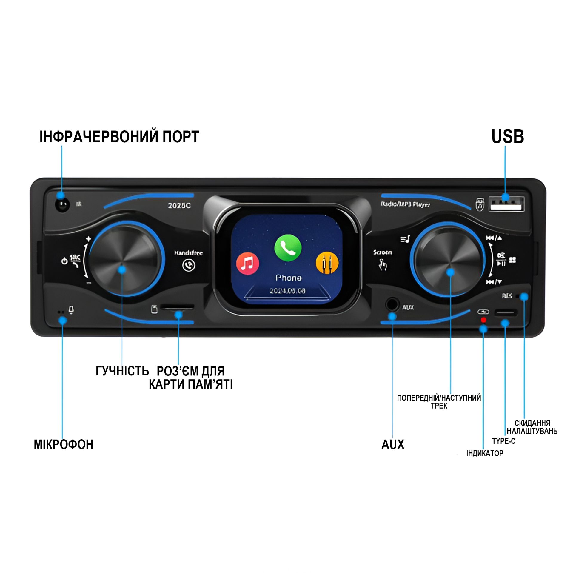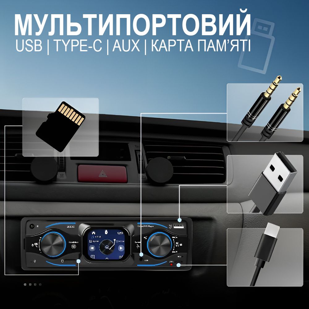 - USB та Type-C порти для зарядки й відтворення медіа.