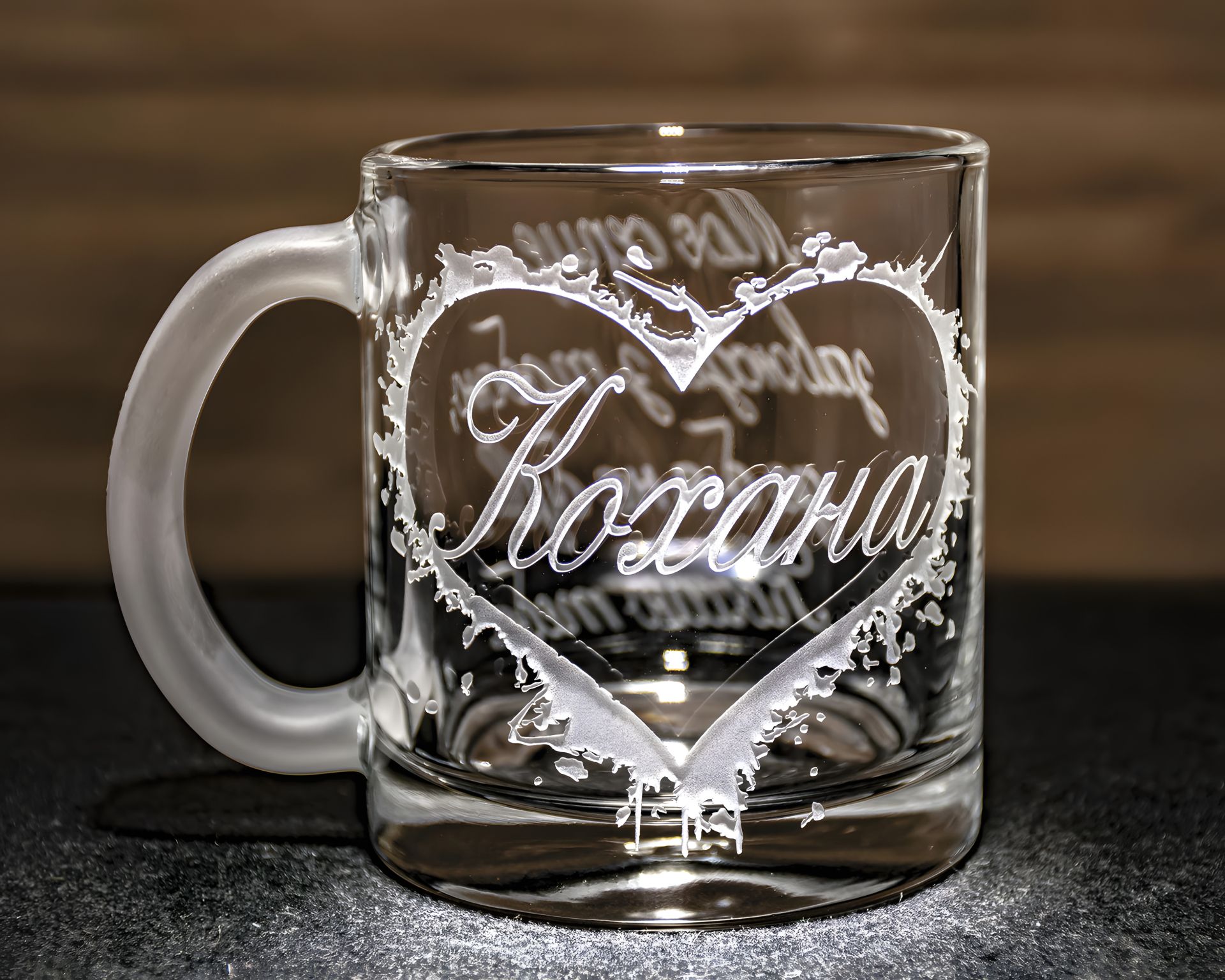 - Гравіювання з характером: Напис вигравіюваний не лазером, не є наліпкою або нафарбованим, а нанесений на скло з використанням особливої технології механічної обробки. Це створює відчуття рельєфу та об'ємності зображення, що надає чашці деякої чарівності.