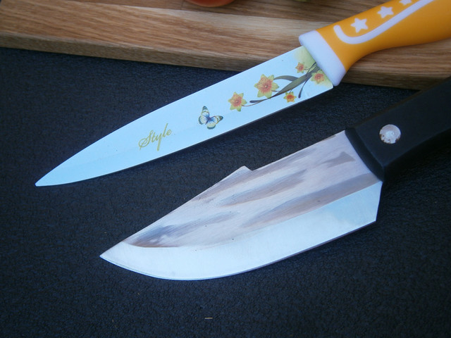 Виготовлений ніж із нержавіючої сталі 5Cr13MoV (0,5% вуглець, 13% хром, молібден, ванадій), що відрізняється високими показниками корозійної стійкості, а також простотою виправлення вертляної кромки.