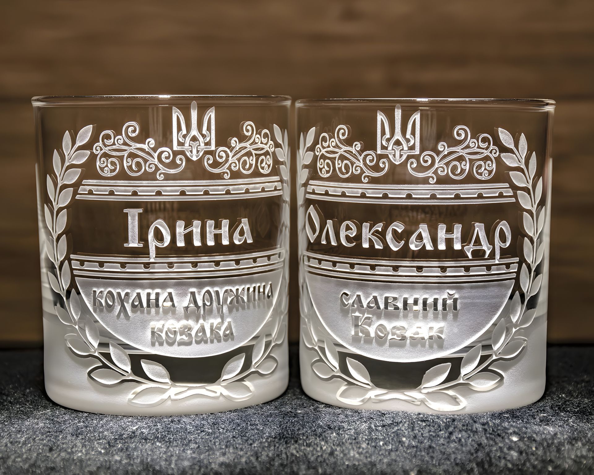- 2 склянки для віскі по 300 мл — гравіювання за вашим макетом: ім’я, лого, шеврон, фраза («Справжній козак», «Дружина славного козака» тощо).