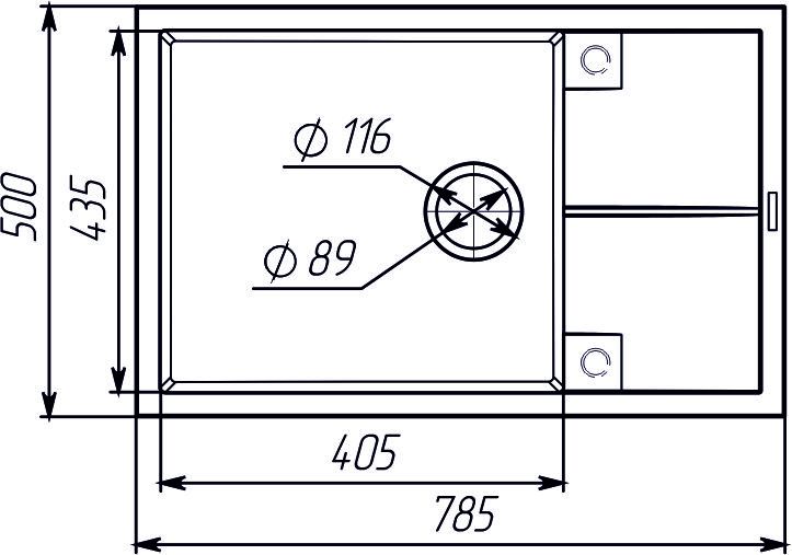 Мойка имеет просторные размеры (ШхГхВ: 790×500×200 мм) и глубокую основную чашу (ШхГхВ: 490×440х200 мм). Это обеспечивает комфортное мытье даже крупной посуды.