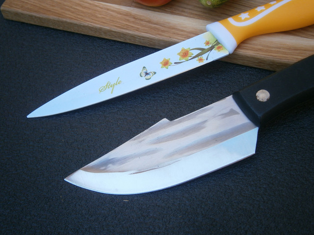 Виготовлений ніж із нержавіючої сталі 5Cr13MoV (0,5% вуглець, 13% хром, молібден, ванадій), що відрізняється високими показниками корозійної стійкості, а також простотою виправлення вертляної кромки.