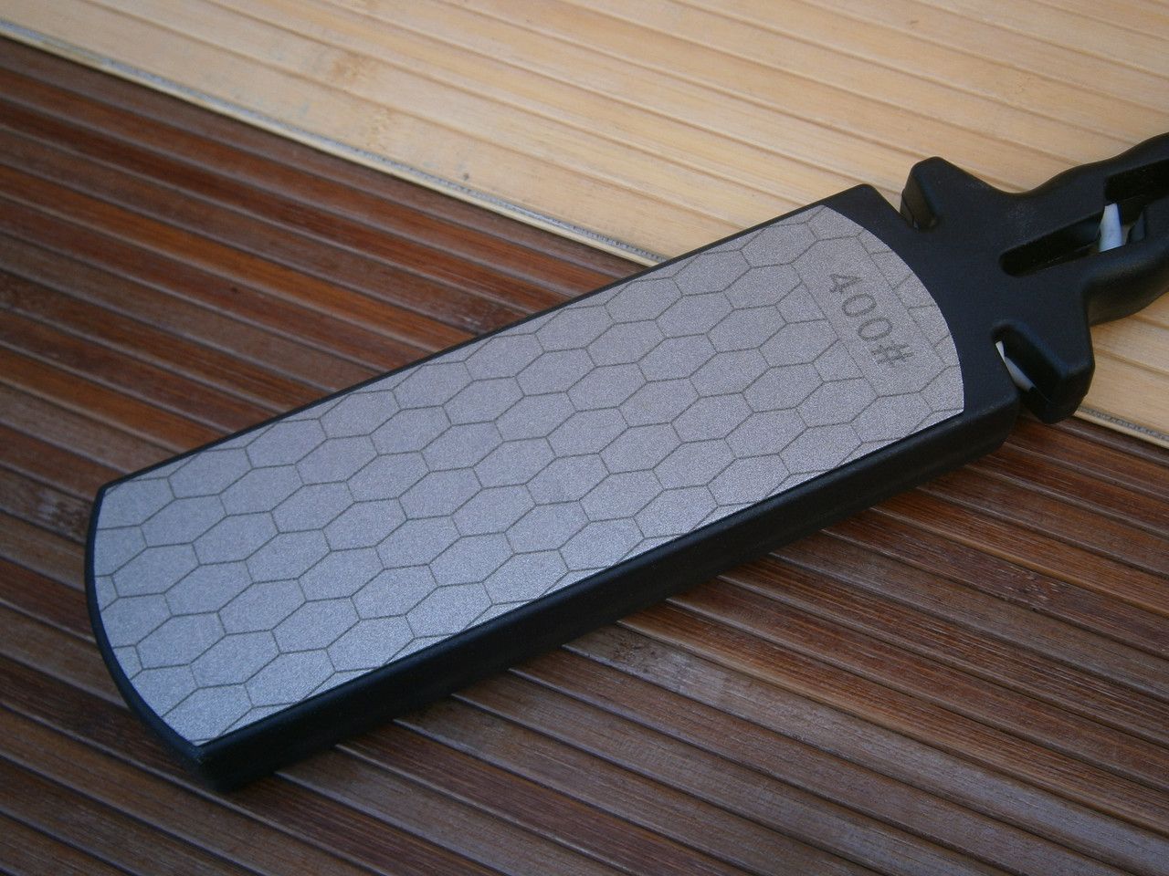 - З одного боку знаходиться алмазна пластина зернистістю 400 грит, призначена для грубого заточування леза з формуванням необхідного кута;