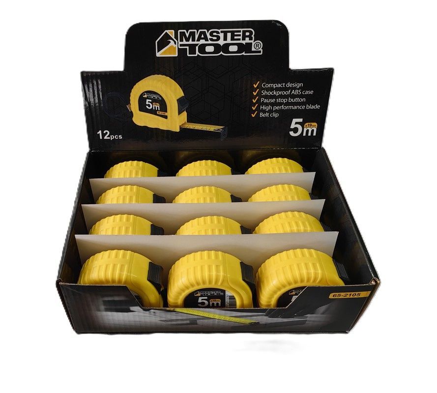 Рулетка 5 м х 19 мм фіксатор полотна кнопка STOP протиковзкий гачок 12 шт SHOWBOX MASTERTOOL 65-2105PC