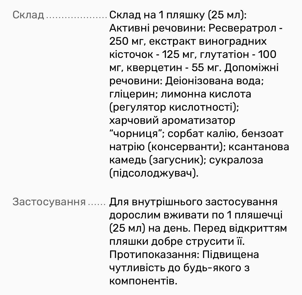 Ресвератрол: потужний природний поліфенол, що міститься у винограді, і бере участь у підтримці антиоксидантного захисту організму та позитивно впливає на концентрацію уваги й психічне здоров'я.Кверцетин: рослинний флавоноїд, що бере участь у підтримці природного антиоксидантного захисту організму.
