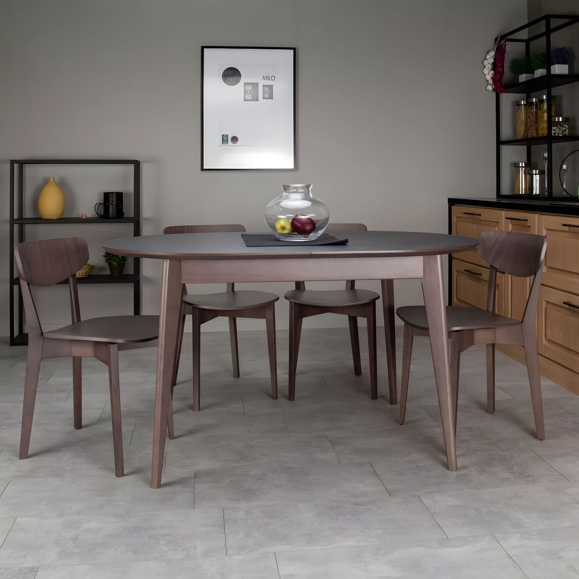 Форма стільниці - овал. Ніжки столу в перерізі мають прямокутну форму і розташовані під невеликим кутом по відношенню до стільниці, що робить стіл більш стильним та витонченим.