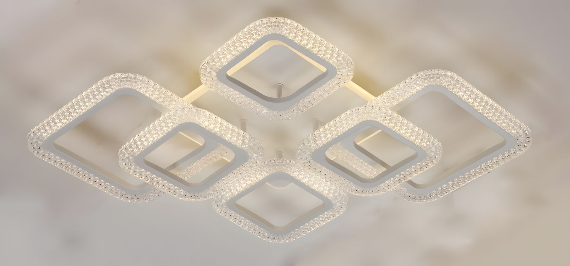 Люстра світлодіодна V K38839-4+2+1 WT — сучасний стельовий світильник у білому кольорі, побудований на комбінації світлових елементів квадратної форми. Конструкція включає чотири основні квадрати, два додаткові та один центральний, які утворюють багаторівневу композицію. Така геометрія надає люстрі виразного вигляду й дозволяє створити рівномірне та насичене освітлення по всій площі кімнати.