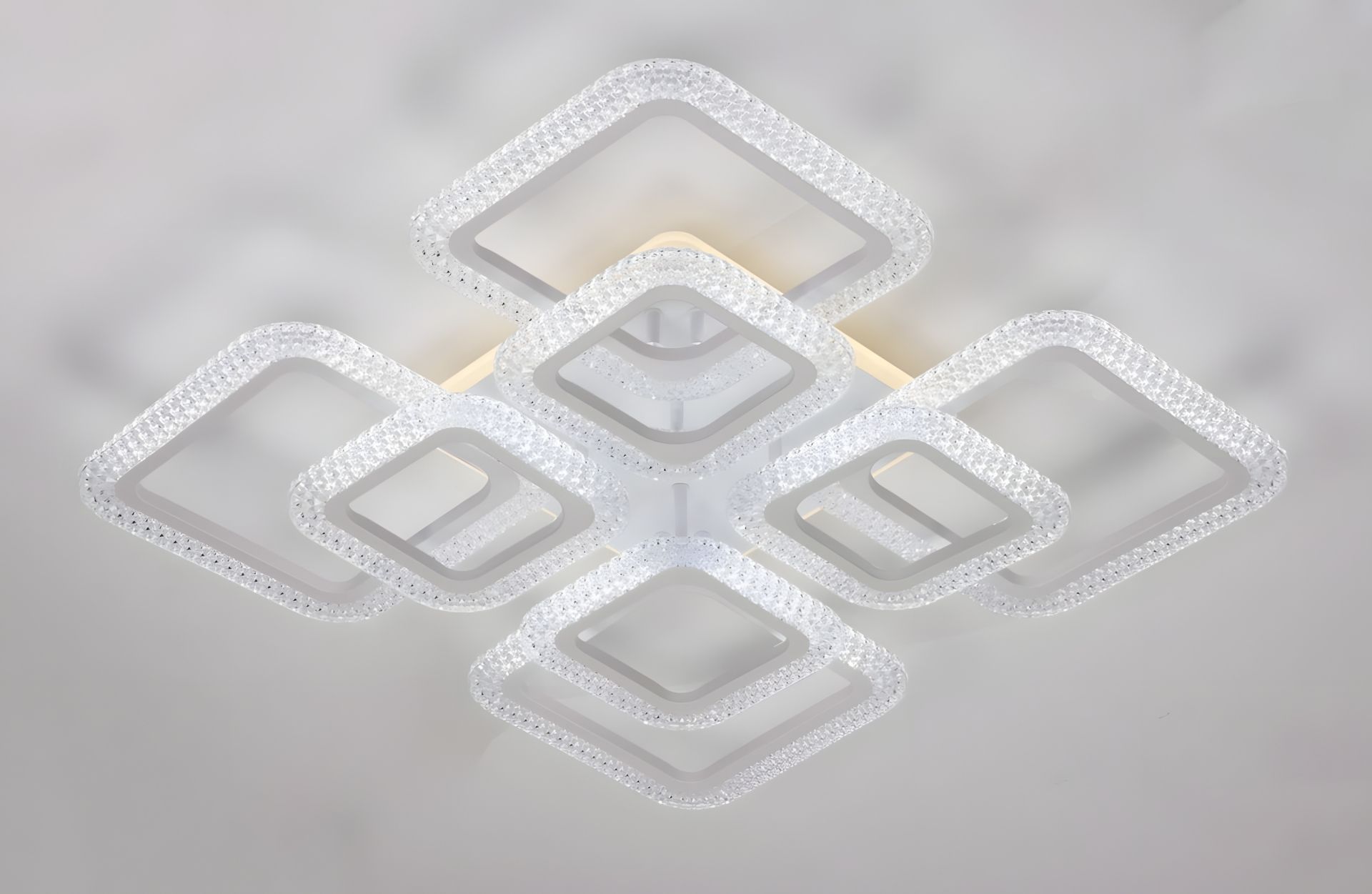 Люстра виконана у чистому білому кольорі, що забезпечує її універсальність та візуальну легкість, незважаючи на значні розміри. Завдяки вбудованому LED-модулю загальною потужністю 220W, світильник забезпечує дуже яскраве та насичене освітлення.
