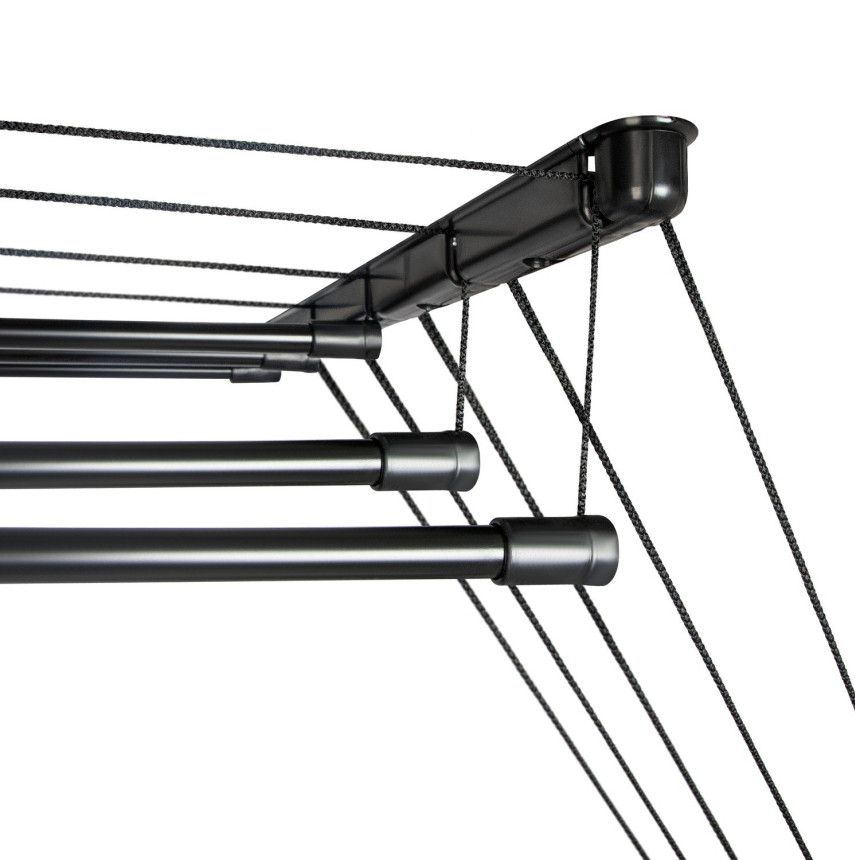 Сушарка для білизни стельова найчастіше використовується на балконі. Має 5 металевих трубок, покритих надміцною порошковою фарбою, які можуть опускатись за допомогою мотузок. Є можливість налаштування опускання трубок по одній або всі разом, та під будь-який зріст. Кріплення до стелі пластикове. Максимальне навантаження на одну трубу 2 кг, або на всі разом - 10 кг. Для кріплення такої сушарки необхідно мати два міцних місця для кріплення на стелі, шириною 45 см, та одне на стіні, шириною 11 см, для фіксатора висоти.