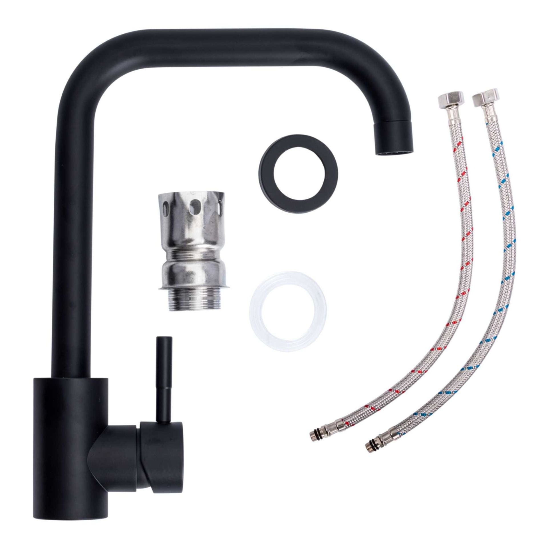 Стильний змішувач VALESO BG77 Гармонійним доповненням до мийки слугує змішувач VALESO BG77 у чорному матовому кольорі. Його витончений дизайн та зручна висота (275 мм) дозволяють легко наповнювати великі каструлі. Змішувач має довжину виливу 155 мм та поставляється з усіма необхідними кріпленнями та шлангами для швидкої установки.